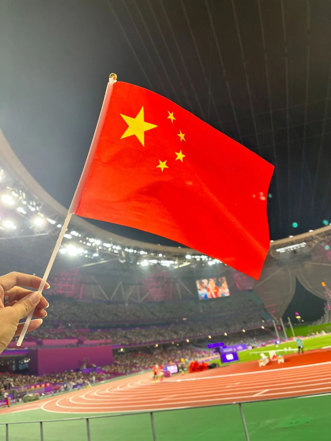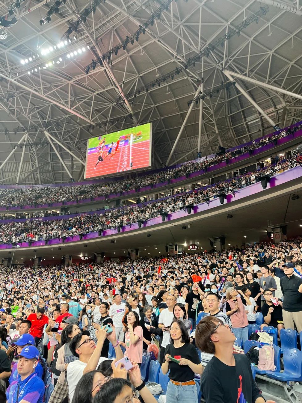 松江市民赵女士在“大莲花”连续“追”了三天田径比赛,与现场观众一起呐喊助威。她无比激动和自豪地说:“现场氛围真的很赞,几万名同胞齐声为中国运动员喝彩加油,声浪犹如海啸般震撼。每当中国队夺冠,国歌奏响、国旗升起的那刻,令每一颗‘中国心’澎湃不已!”