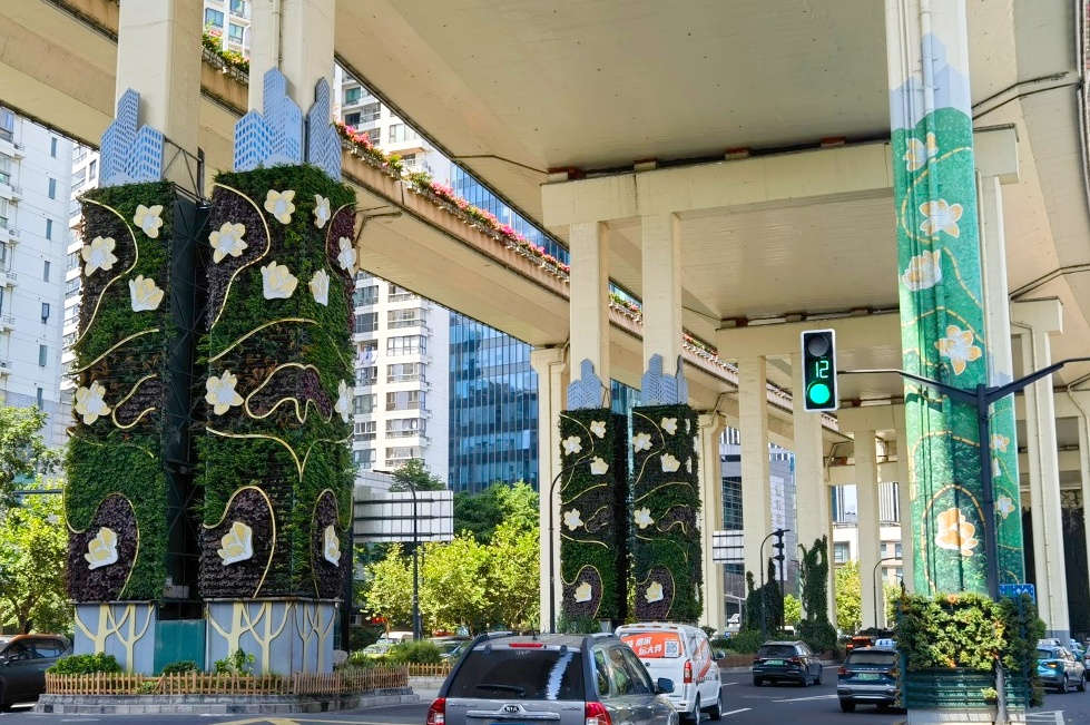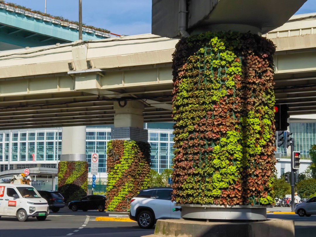 桥柱绿化是以桥柱为载体,以攀缘植物,柔韧性强、耐修剪的植物,模块栽植植物为主体建设的一种立体绿化形式,常见的有高架、轨交、天桥等桥柱绿化。作为立体绿化的重要形式,桥柱绿化在改善城市生态环境,拓展城市绿化空间,提升城市道路绿视率等方面起着重要作用。