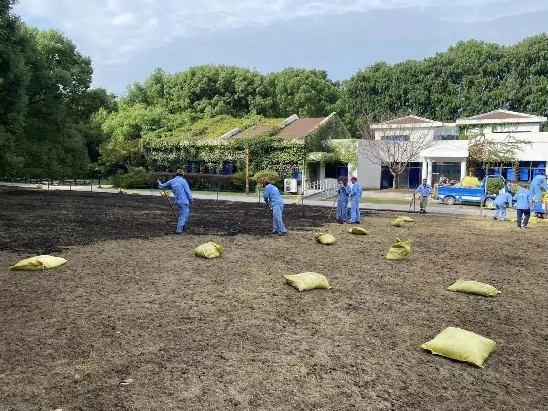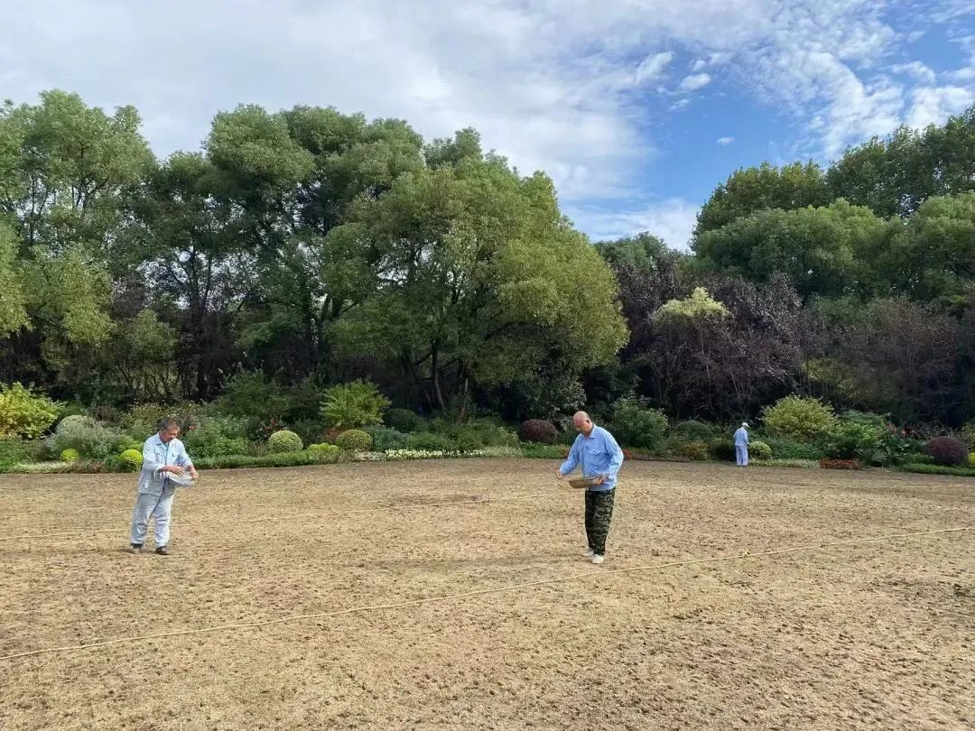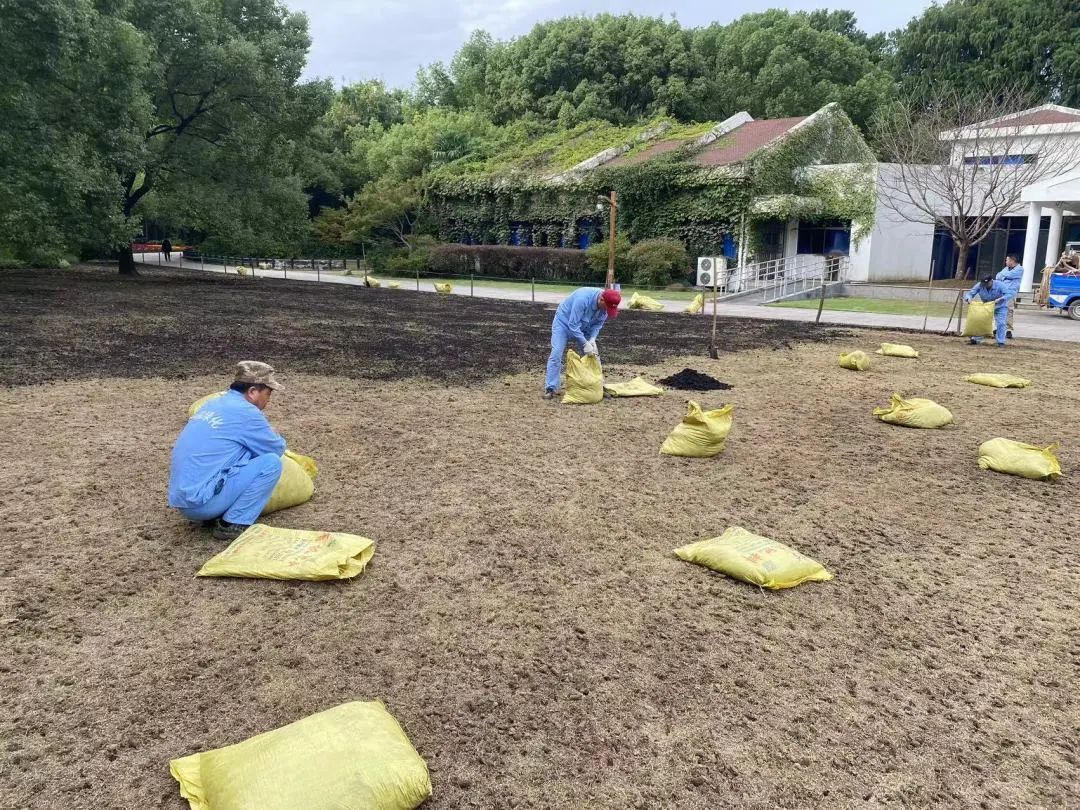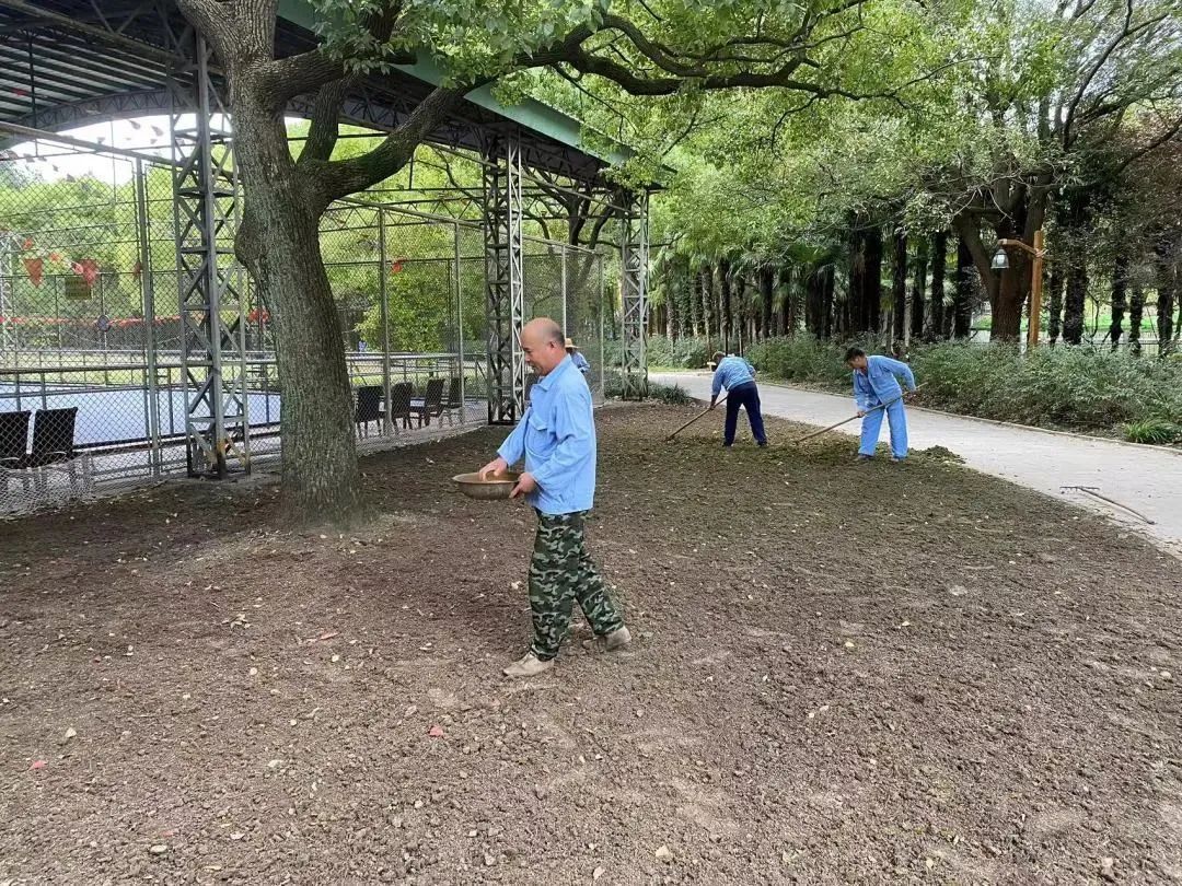 养护师傅们分别对活动中心大草坪、悬铃木区林下和主干道路两侧等区域进行了施肥和交播黑麦草籽工作。