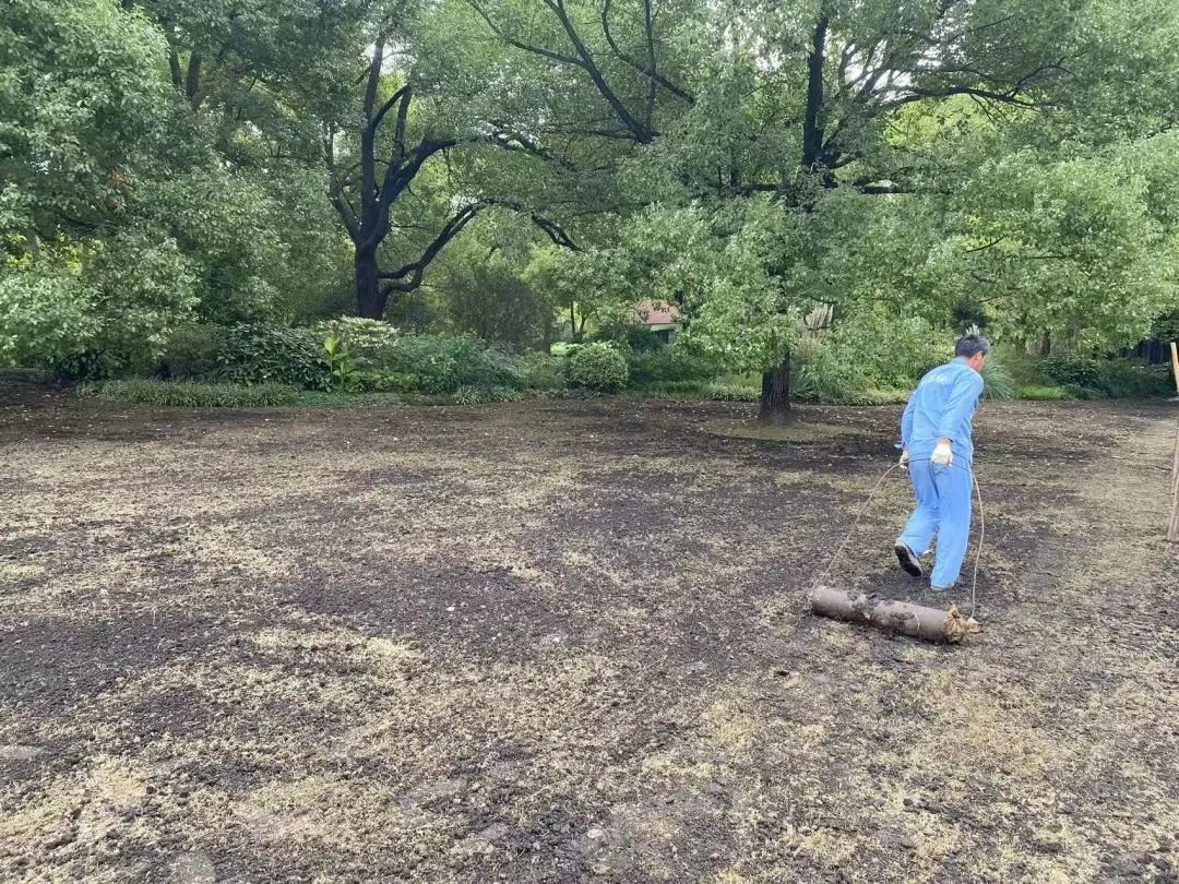 养护师傅们在完成施肥工作前,会先进行除杂草、人工打草和草坪打孔处理工作,然后再播撒草籽,进行滚压,最后进行补水作业,保持土壤湿润,避免草坪受旱,确保草籽发芽生长。