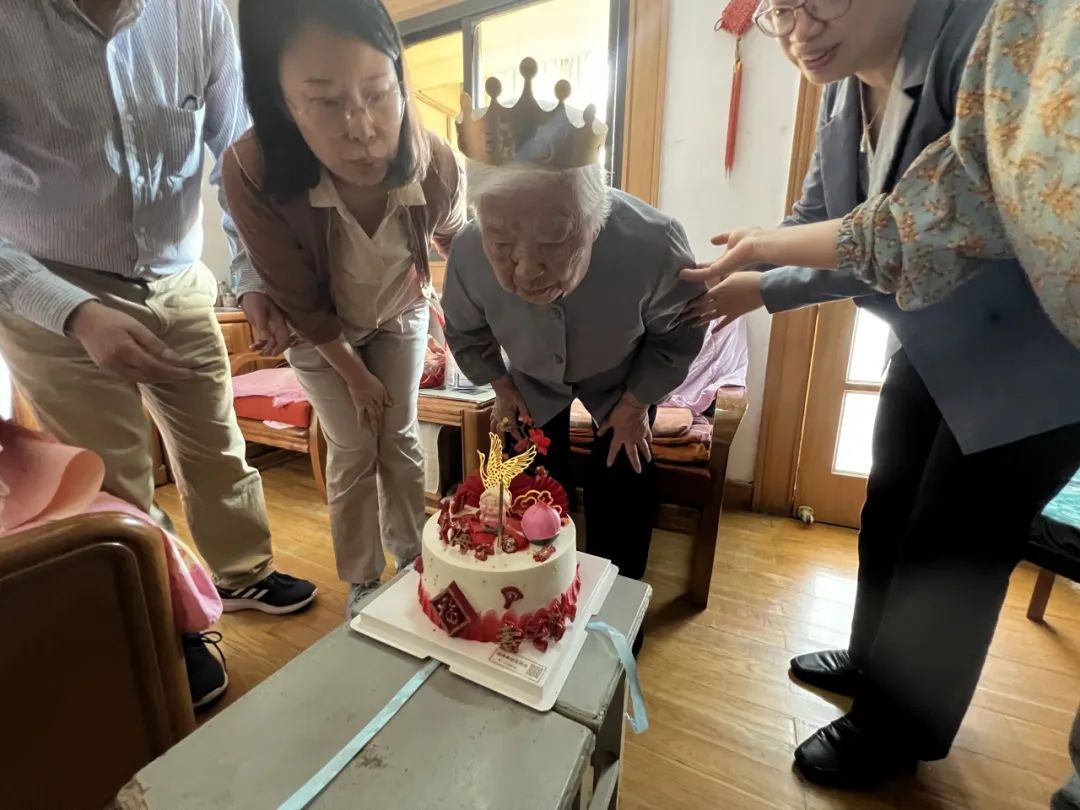 随着生日快乐歌的唱响,陈阿婆在众人的祝福中许下心愿,吹灭了蜡烛,与大家分享蛋糕。