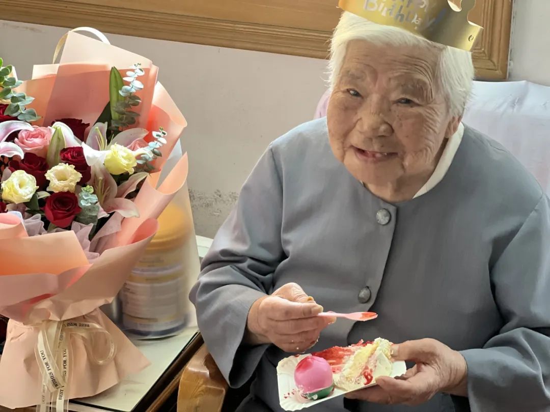 “祝你生日快乐,祝你生日快乐……”欢乐的歌声从四平路街道鞍山五村10号楼里传来。百岁的陈阿英戴着寿星帽,拍着双手,在大家的簇拥中眉开眼笑。