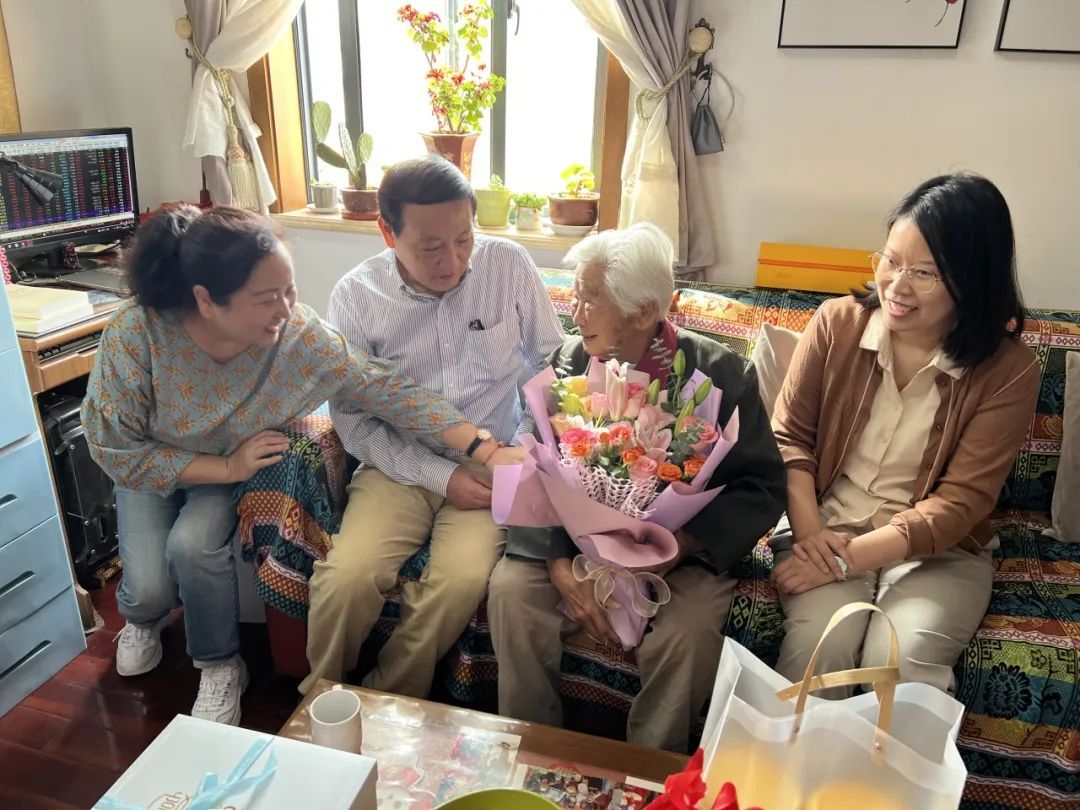 就在同一小区的另一栋楼里,百岁老人曲洪兰也迎来了街道重阳节的慰问。老人今年的生日已过,街道、居委一行人赶在重阳节前夕,带着礼物上门,向老人送去了节日祝福,也向家属详细询问了老人的身体情况。得知老人当前身体硬朗,精神矍铄,大家发出了真诚的赞叹,也纷纷嘱咐老人继续保持生活作息,注意健康。
