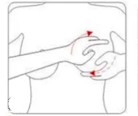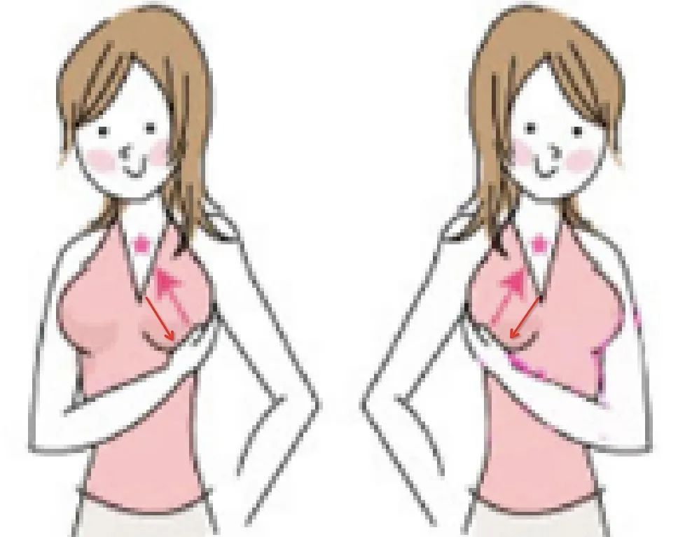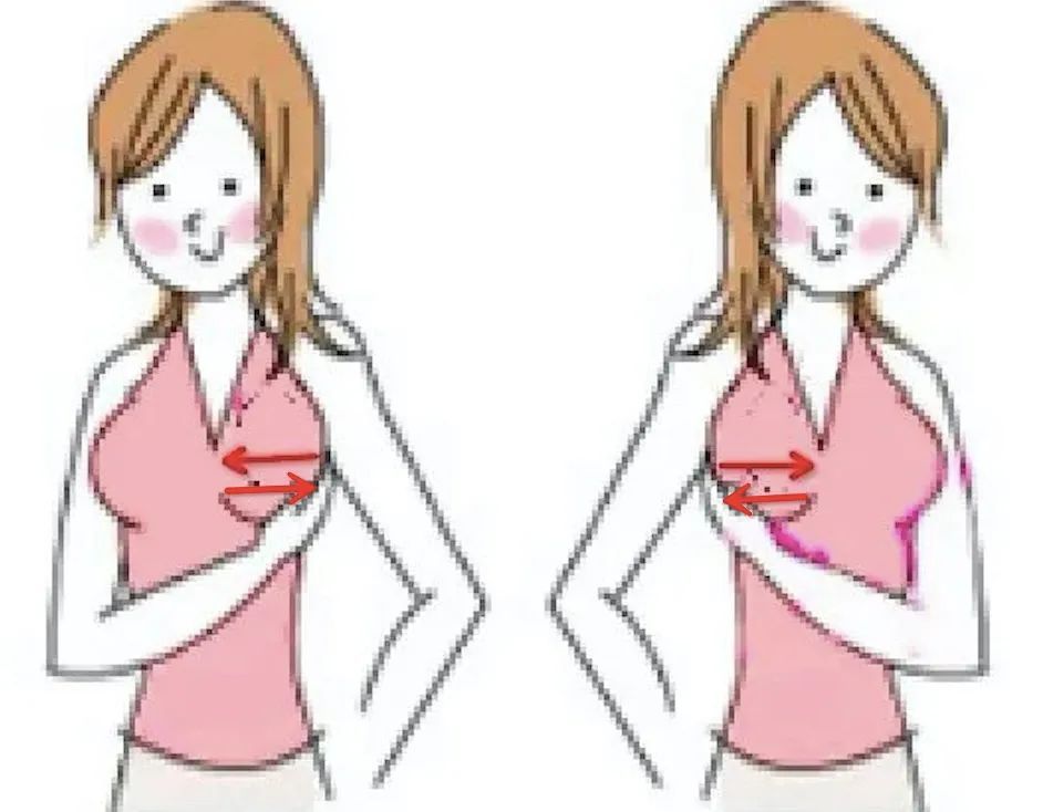 托推乳房: 用右手托住左侧乳房根部,然后用右手掌与左手相对向乳头方向合力托推20-30次。然后再托推右侧乳房20-30次。
