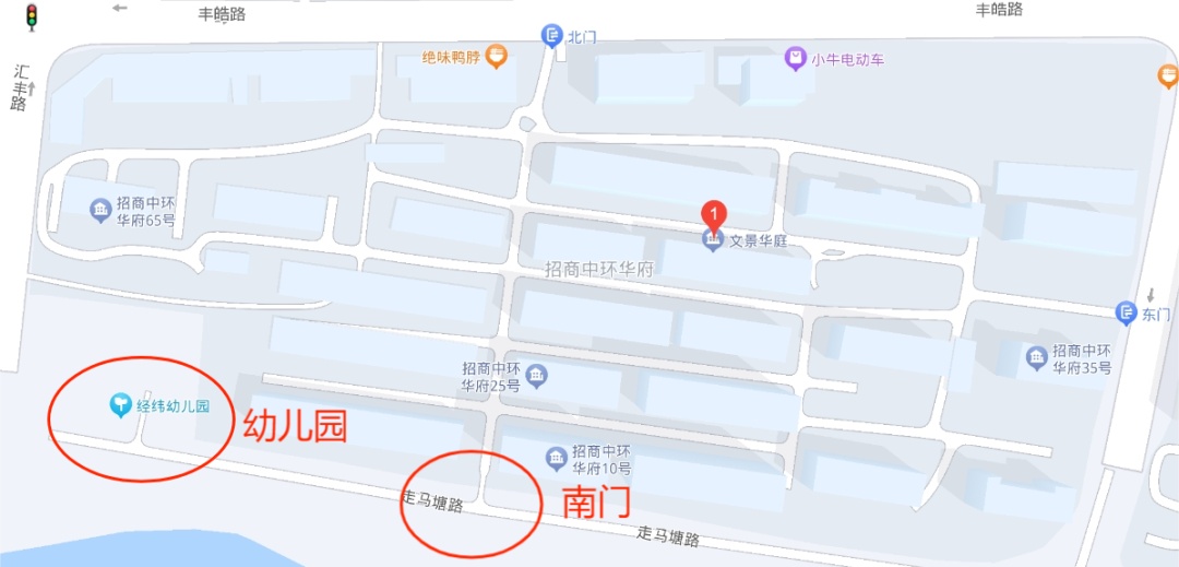 文景华庭居民区东起鄂尔多斯路、南至走马塘路、西至丰汇路、北至丰皓路。小区设有东南西北四门,南门和西门为消防应急通道门,平日不开放,东门和北门为人行和车辆通行道。2022年下半年,随着配套幼儿园正式投入使用,居民们对于开放南门的呼声日益强烈。