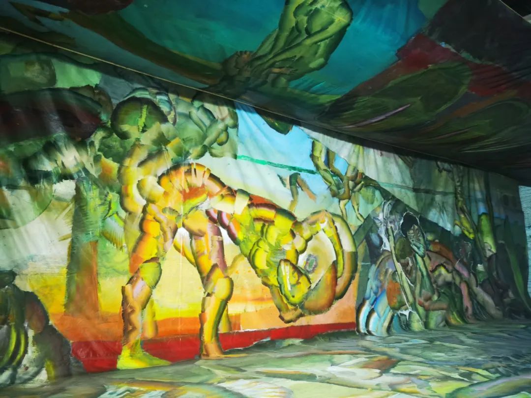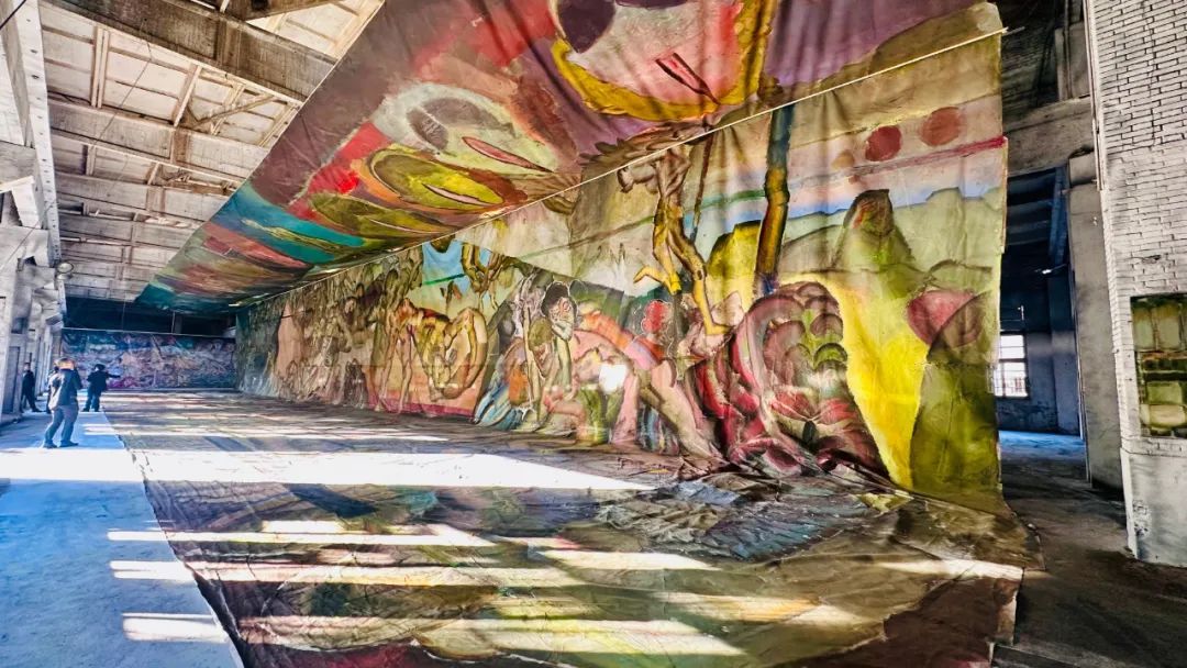与“星链”一墙之隔、名为“降临的梦境”的展示空间里,一幅50×20米的超大幅画布将偌大的厂房装扮成一个神秘世界。午后的阳光透过没有玻璃的窗房照进“梦境”,画布上仿佛也留下了时间的轨迹。