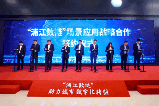 仪式现场,上海浦江数链数字科技有限公司、信医科技公司分别参与了签署区块链场景应用框架合作协议、发起成立“浦江数链”产业发展联盟等活动。