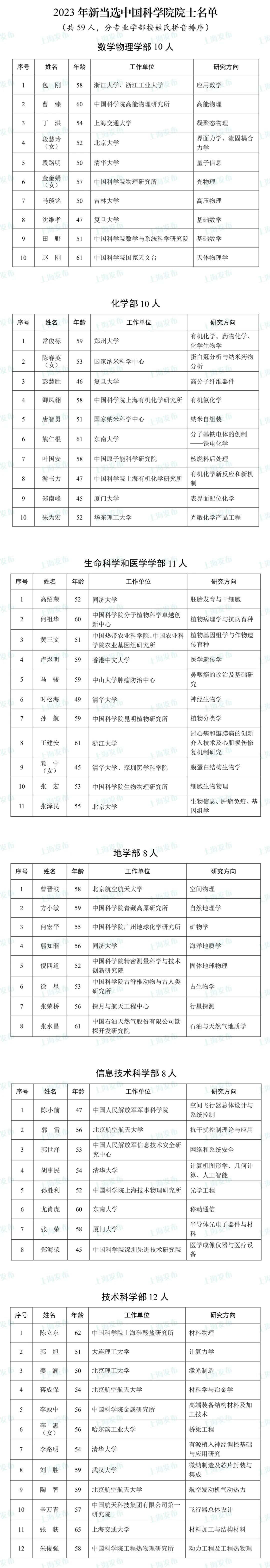 昨天下午,中国科学院学部网站发布2023年院士增选结果,选举产生了59名中国科学院院士。