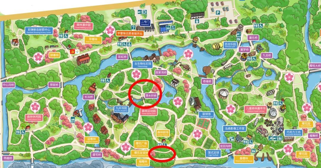一号门入园→悦林大道→樱花大道→芸香路→杉树林→清水轩桥