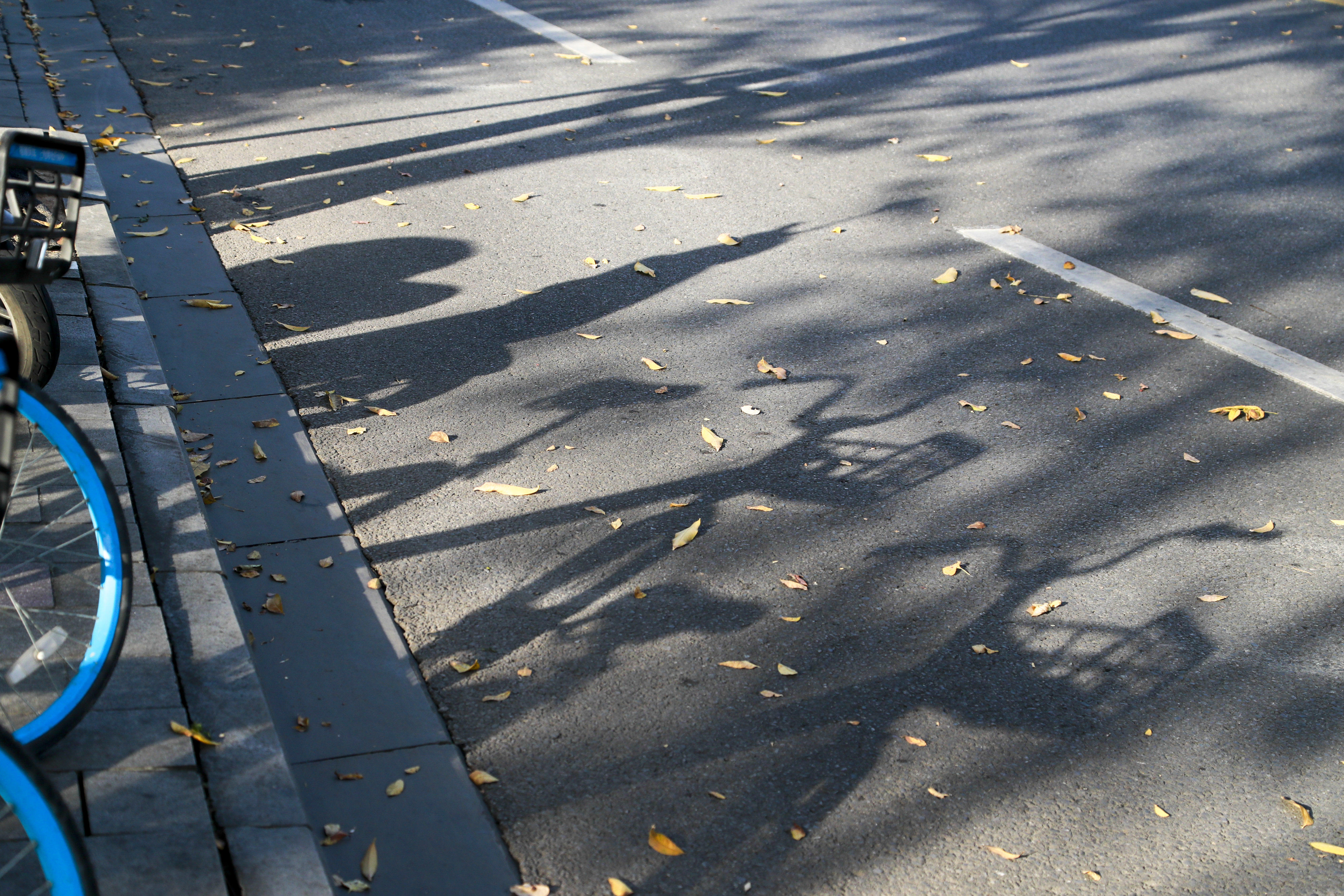 再低头看看脚下,被风吹落一地的金色树叶飞舞在道路间、树荫下,它们在光影的“装扮”下,像一幅幅“限定”画作,发挥想象,也绝不会让你失望。
