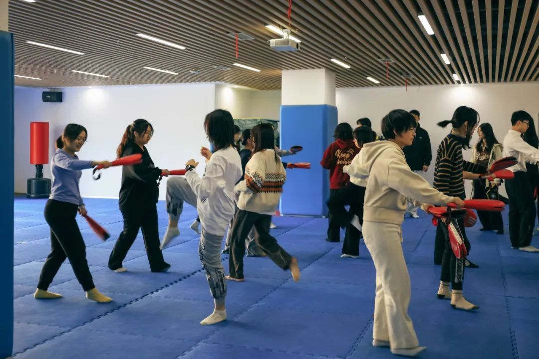 运动场馆里,学生们正在上体育课、健身,这里一楼为上财健身中心及多个体育项目活动室,二三楼为篮球训练场。