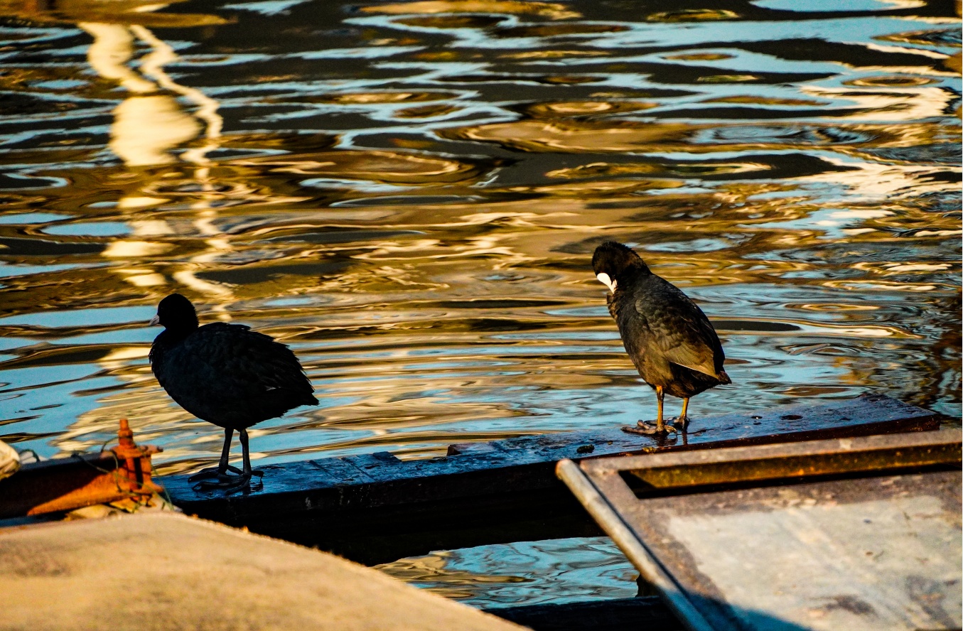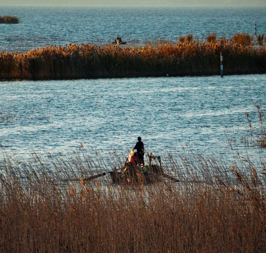 “船头一声鱼魄散,哑哑齐下波光乱”,渔民泛舟湖面,唱着悠扬的渔歌,摇橹撒网,用传承千年的古老技艺展示着捕鱼技艺。渔船码头上,野生的“白骨顶”丝毫不惧怕人来人往,在暖金色的夕阳中整理着羽毛,等待着归港渔船带回的小鱼小虾。