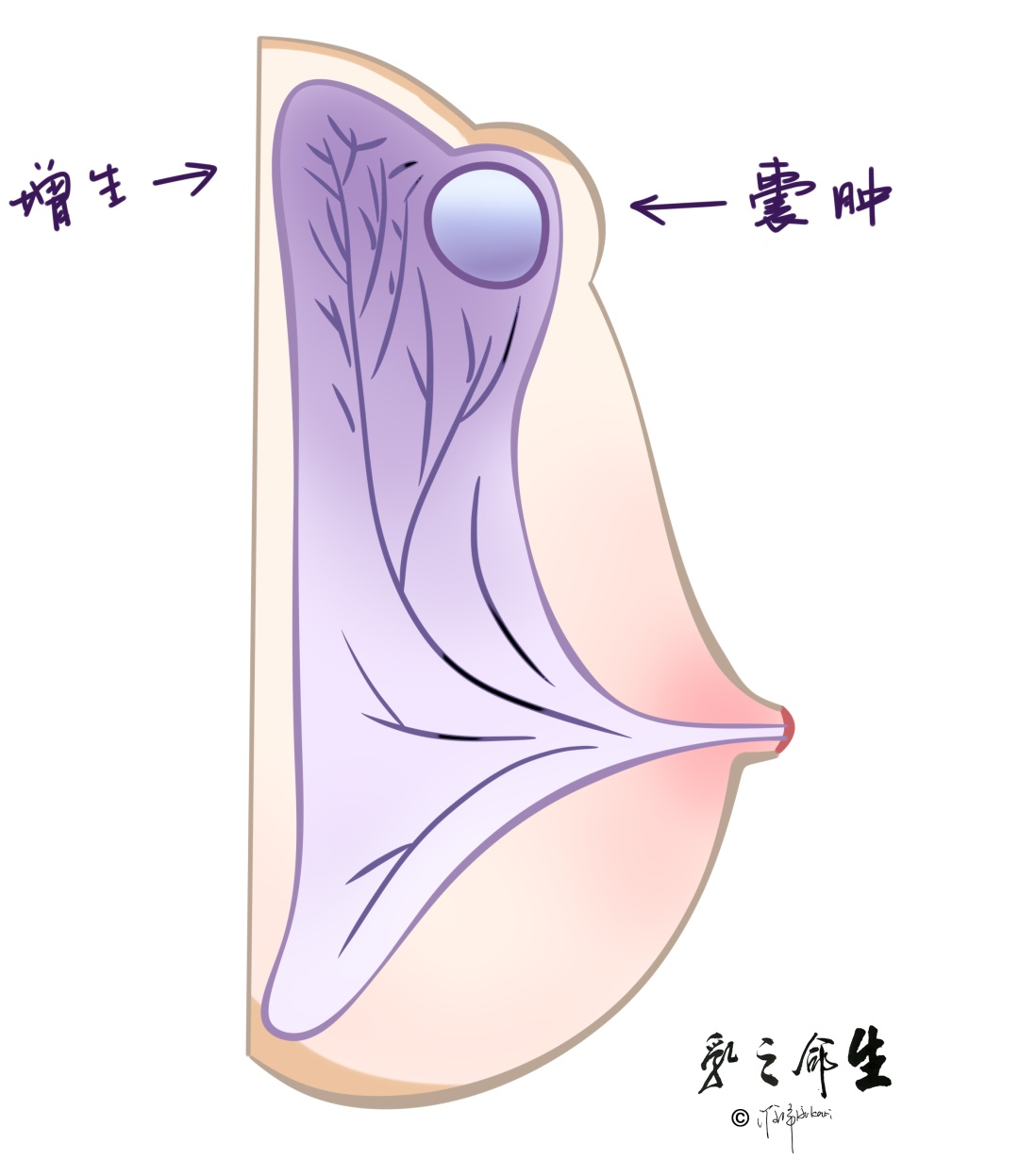 乳腺增生与月经周期有关,受激素影响,经历增生和复原的过程。排卵前每个小叶腺泡开始扩张变大、输乳管开放,因而女性在月经前感到乳房胀痛,并可触及弥漫的结节感,这是胀大的腺叶,此为“生理性乳腺增生”;月经过后,扩张的乳管收缩关闭,乳房变软,恢复成原来的大小。如果激素调节出现问题,有的乳腺小叶无法恢复,维持了增生状态,就造成乳腺组织的结构紊乱,出现持续存在的结节与疼痛,且可随情绪变化而波动,此时即诊断为“乳腺增生症”,即“病理性乳腺增生”。分为囊性增生和腺性增生。囊性增生以乳腺导管扩张和导管上皮增生为主要改变,严重者出现乳头溢液和乳腺囊肿;腺性增生以乳腺小叶和结缔组织增生为主要特征,例如硬化性腺病等。乳腺增生并非癌前病变,轻度乳腺增生极少发展为乳腺癌,但是纤维性腺病,硬化性腺病等癌变风险相应增加。