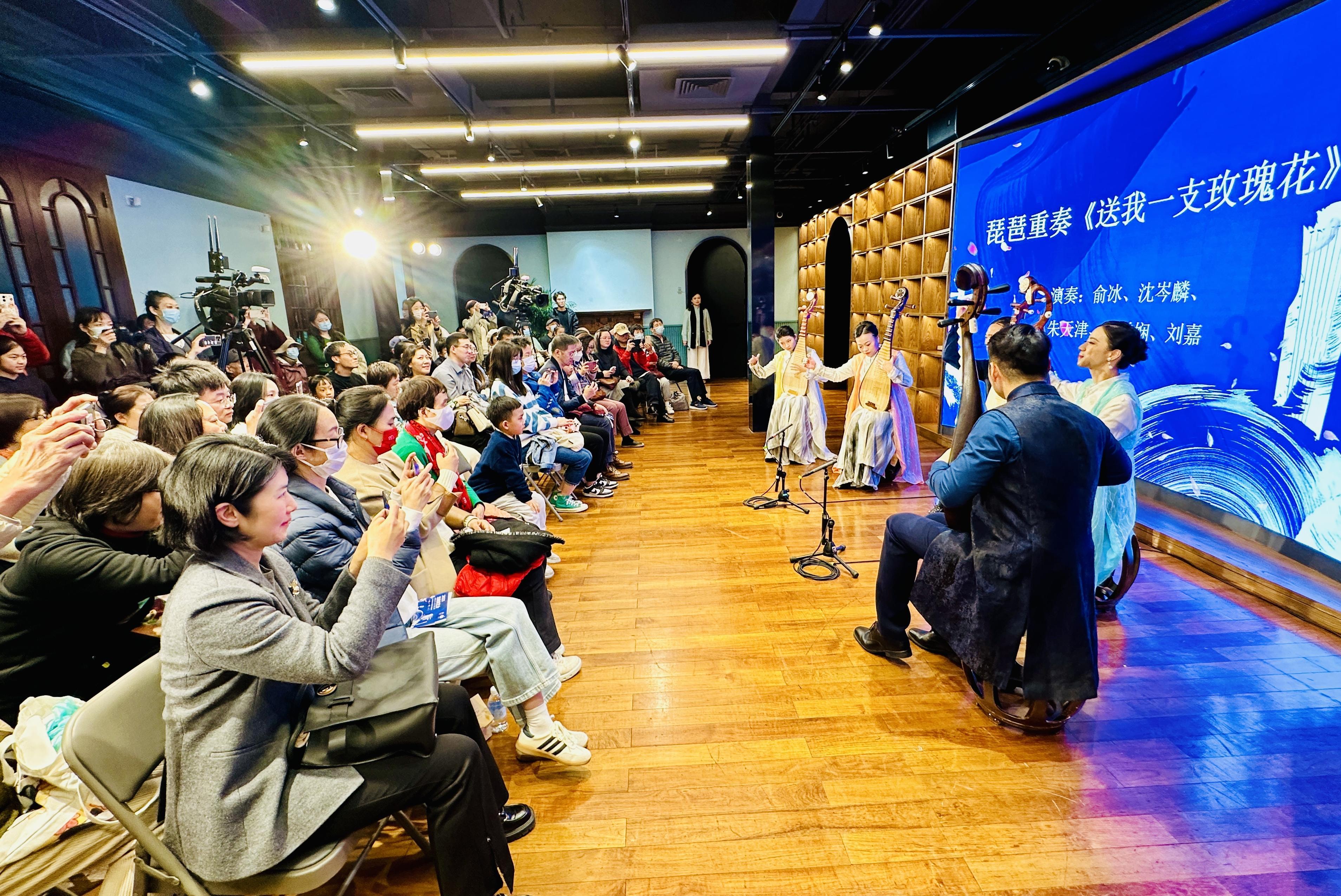 上海民族乐团琵琶声部首席俞冰携乐团琵琶演奏家沈岑麟、朱天津、刘雪娴、刘嘉,为观众带来了《龟兹舞曲》《虚籁》《新翻羽调绿腰》《送我一支玫瑰花》等多首琵琶独奏和琵琶重奏,与观众一同在琵琶演变的视角下重走丝绸之路。