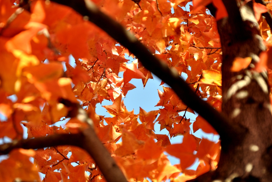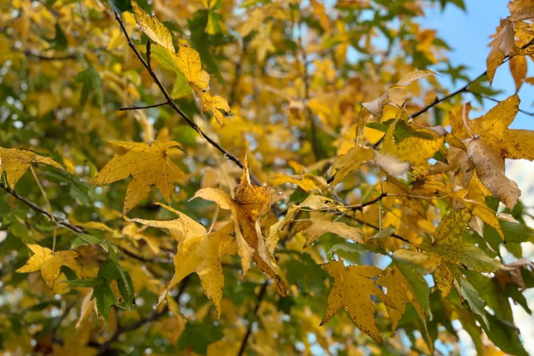 北美枫香春夏叶色暗绿,秋季叶色逐渐变成黄、红、紫等多彩缤纷的颜色。