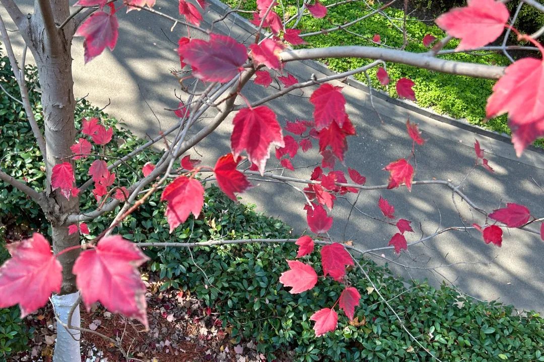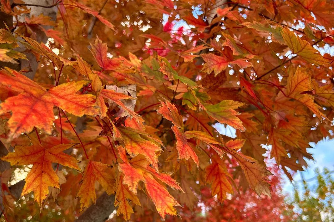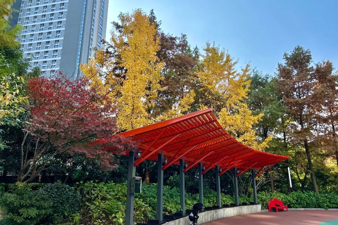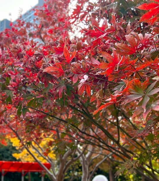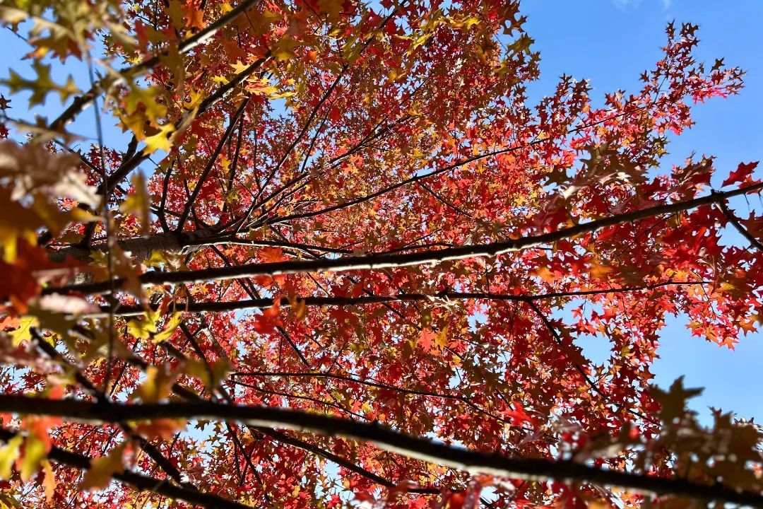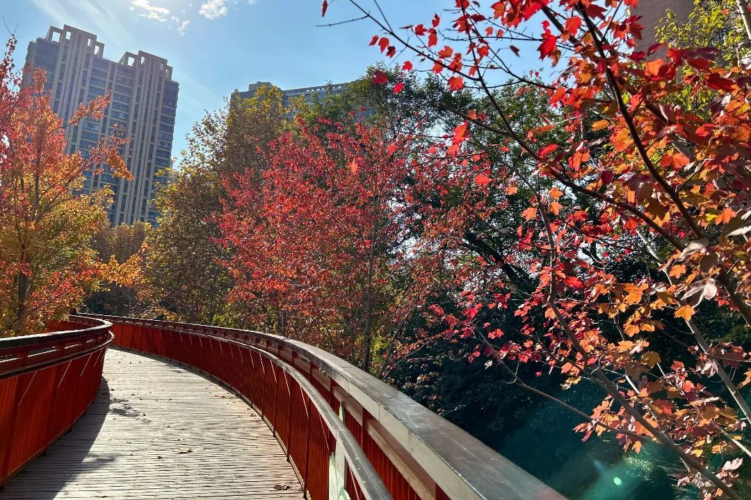 爱思儿童公园内的红花槭主要集中在少儿游乐区一侧。走上彩虹桥,红艳艳的树叶触手可及;向下俯瞰,透过树叶,又是另一番妙趣横生的画面。