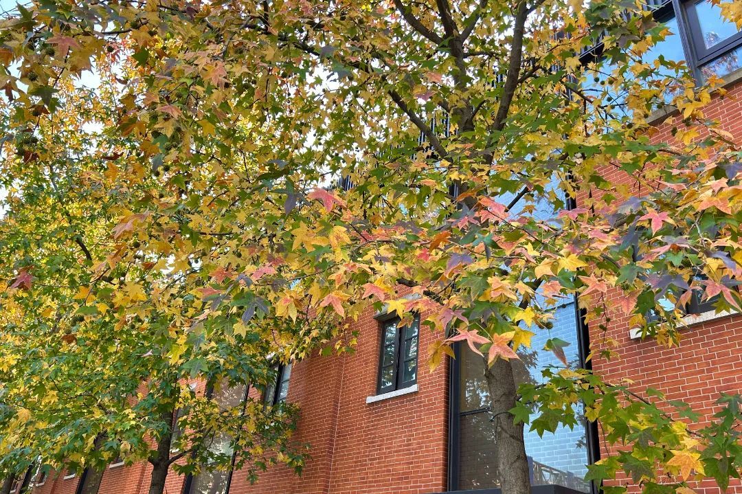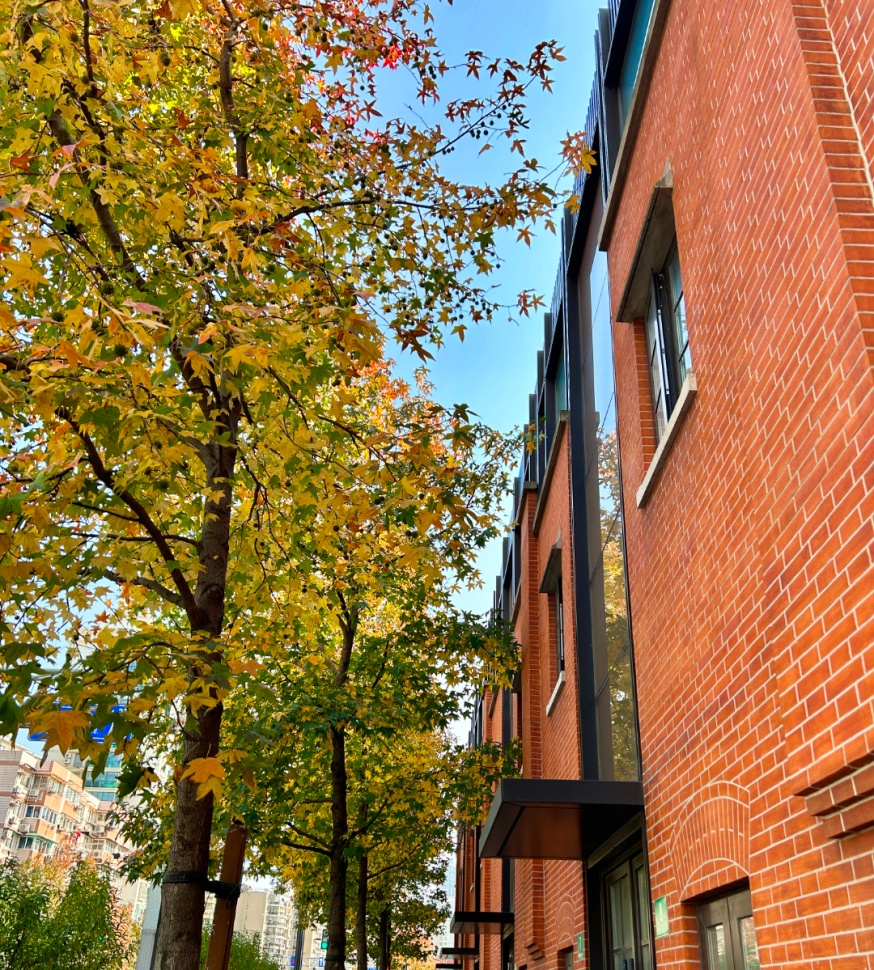 在海伦路上,北美枫香与红砖石库门建筑相映成趣,充满了老上海风情。一阵风吹过,树上的果实“沙沙”作响,仿佛在述说着历史的沧桑。