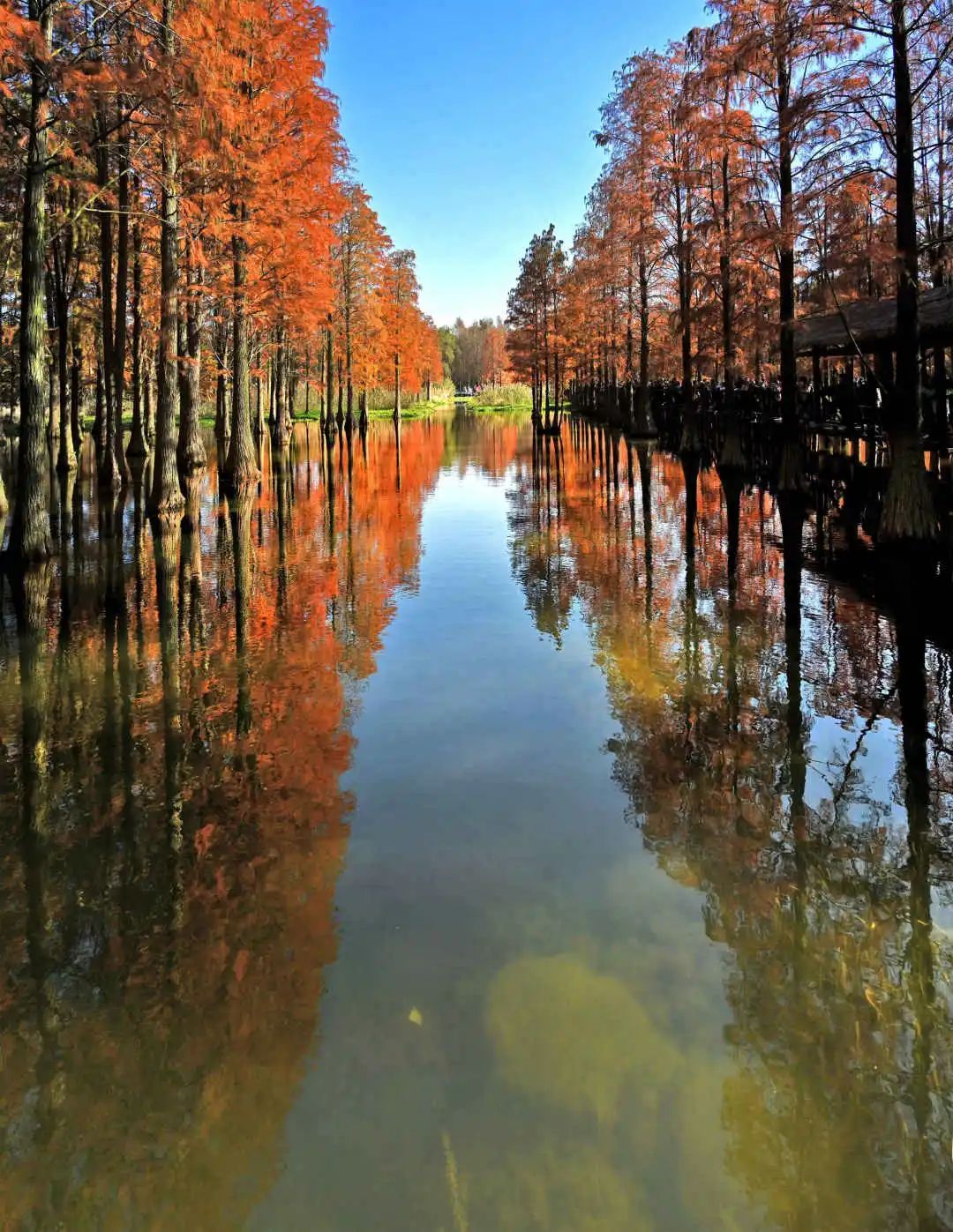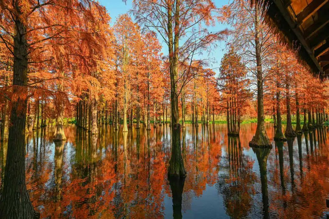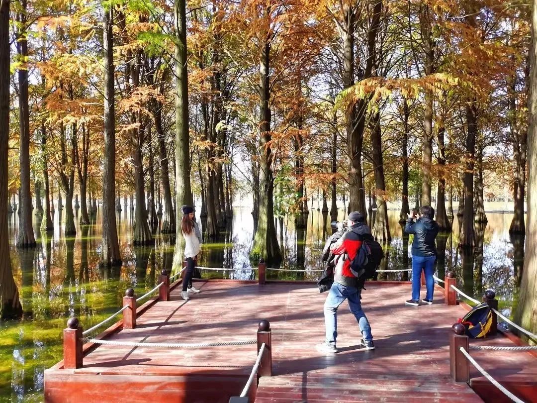 沿着亲水栈道穿行在林间,水杉、池杉、落羽杉参天而立,阳光被切割成一道道相间的光影投射在林间,给这片森林增添了几分神秘感。粗大、斑驳的树根牢牢扎在水中,如镜的水面倒映着杉树笔直的身躯,火红的杉叶层层叠叠将清澈的湖水也映照成娇艳的红色。透过湖面,底下的水草与嬉戏的鱼儿清晰可见。偶尔一阵调皮的风掠过水面,将倒映的光线和树影打成一池碎金。