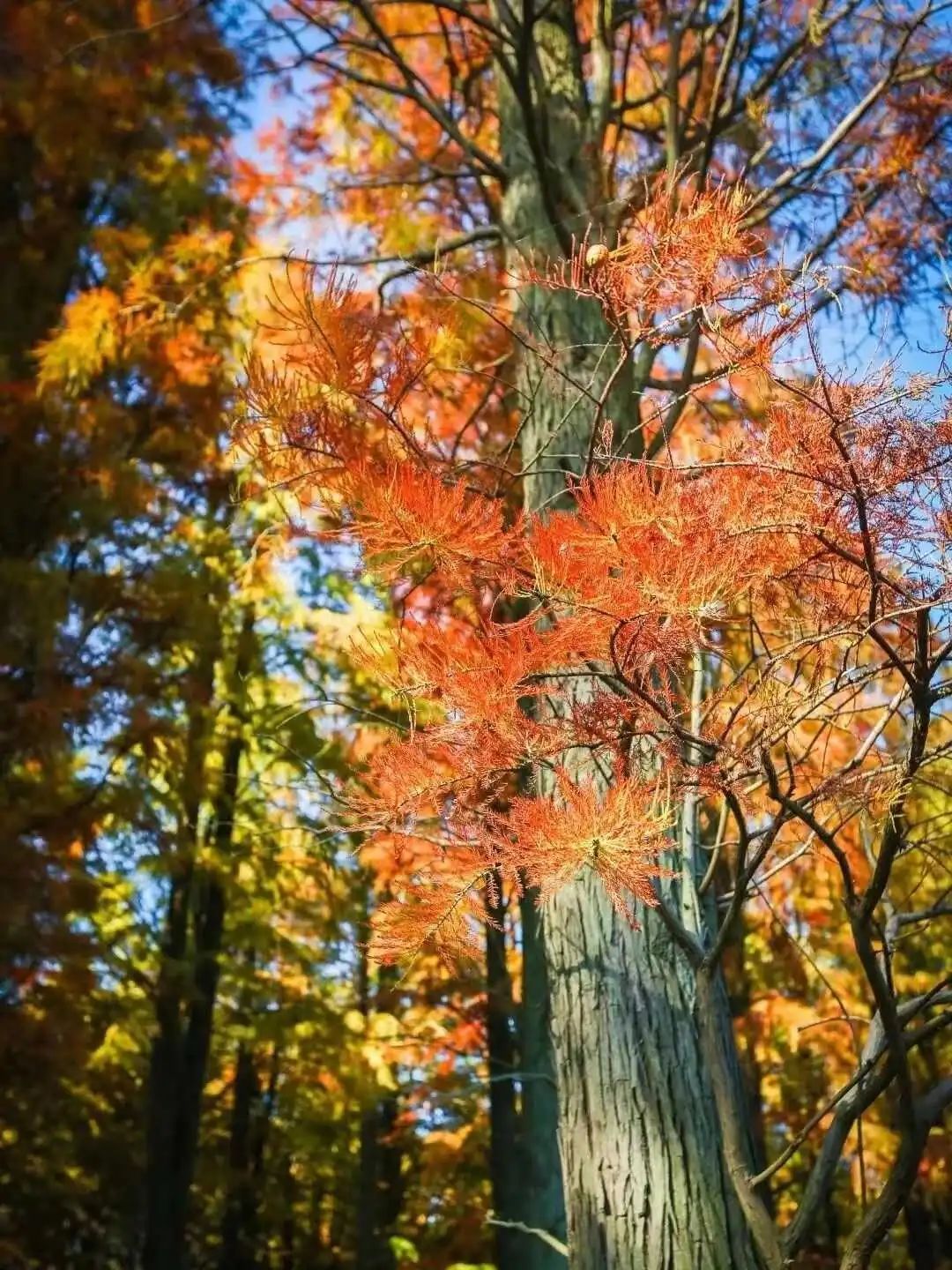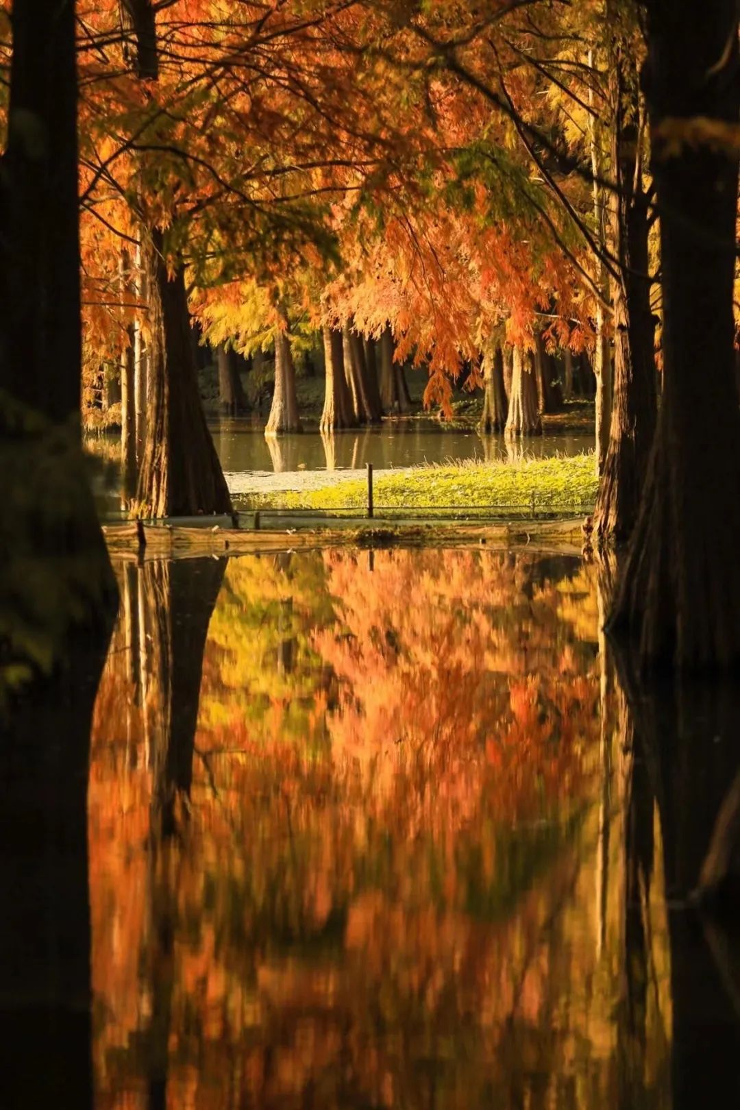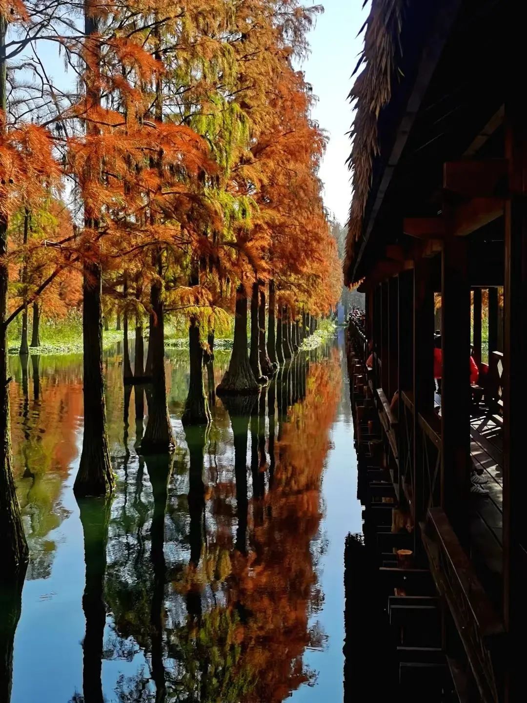 沿着亲水栈道穿行在林间,水杉、池杉、落羽杉参天而立,阳光被切割成一道道相间的光影投射在林间,给这片森林增添了几分神秘感。粗大、斑驳的树根牢牢扎在水中,如镜的水面倒映着杉树笔直的身躯,火红的杉叶层层叠叠将清澈的湖水也映照成娇艳的红色。透过湖面,底下的水草与嬉戏的鱼儿清晰可见。偶尔一阵调皮的风掠过水面,将倒映的光线和树影打成一池碎金。