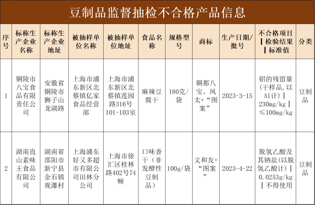 本次抽检信息涉及5大类食品,包括:豆制品、食用农产品、罐头、可可及焙烤咖啡产品和罐头。抽检样品共计537批次,其中合格535批次、不合格2批次。