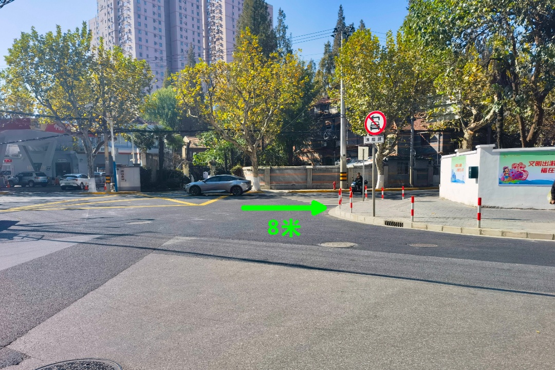 在保障人行道宽度的前提下,将原本三角状人行道向内缩进8米,拓宽车行道。通过合理配置道路宽度,有效释放路口通行压力,保障车辆行驶安全。