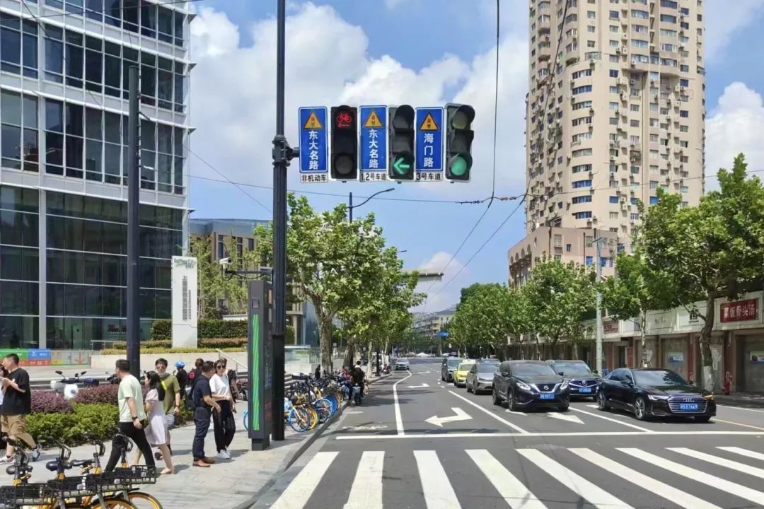 该路口为东大名路与海门路、霍山路的交叉口,布局交错,现加装车道信号灯提示牌,帮助路口经行车辆驾驶员明确行车道对应的信号灯。