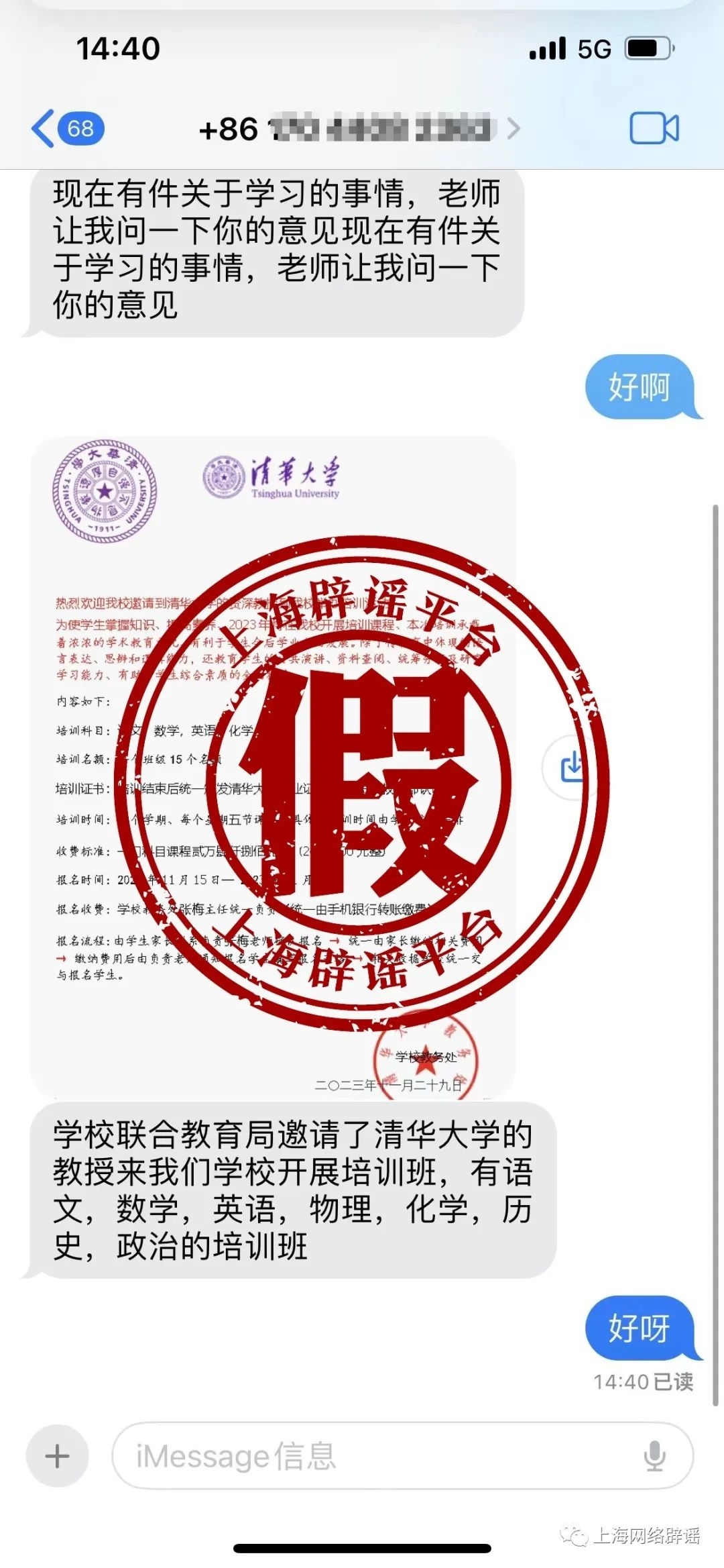 近日,上海市民王女士收到一条短信,对方自称是王女士的女儿,临时用“校讯通”给王女士发信息,所以短信号码是陌生号码。“女儿”说,自己的中学联合教育局邀请了清华大学教授开培训班,5门课程,每门培训费24800元。女儿还以“自己非常想报名培训班,但每个班只有15个名额”为由催促王女士尽快添加培训主任微信并缴费。王女士有所警觉,向女儿的班主任核实,被告知并无此事,学校也没有使用过“校讯通”。 至此,诈骗短信真相大白,王女士便将此事告知上海辟谣平台,希望提醒更多的家长不要上当。 骗子发给王女士的“清华大学培训班通知”。 上海辟谣平台查看王女士收到的短信发现,内容漏洞百出。 例如,字体、字号、颜色不一,行文不规范,语言表达无逻辑;所谓来自清华大学的通知落款是“学校教务处”,但盖章是“清华大学教务处”;报名时间是2023年11月15日-2023年11月29日,落款时间却是2023年11月29日,意味着报名最后一天通知才发出来;通知写“培训结束后统一颁发清华大学专业证书”,但清华大学只会为正式录取并顺利毕业的学生颁发学历、学位证书,没有“专业证书”…… 记者尝试联系对方留的培训主任微信号,系统提示“被搜账号状态异常,无法显示”;拨打发送短信的号码,发现该号码为虚拟号码,无法拨通。 进一步调查发现,利用“清华大学培训通知书”诈骗不是新鲜事,不少网友都分享过自己的遭遇。 这类陷阱的共同点是:通知上都印有清华大学的图标、校训、公章;通知中都承诺培训结束后可以发放与清华大学相关的证书,成绩优异者甚至可以保送上清华;通知中的培训名额有限,报名时限很短;通知中要求家长添加“老师”个人QQ或微信缴费,而不通过学校的正规渠道缴费…… 可见,骗子打着清华大学的名义招摇撞骗,并制造“名额有限”的假象,催促家长交钱。从网友分享帖看,已有不知情的家长为孩子缴费之后发现上当受骗,报警求助。 各式各样的“清华大学培训通知书”,均为诈骗。 上海辟谣平台提醒各位家长,接到这类通知一定要冷静,先找学校和班主任核实通知的真伪,再当面询问孩子的意见,避免冲动之下掉入骗子的陷阱。 来源:上海辟谣平台 编辑:俞萝寅