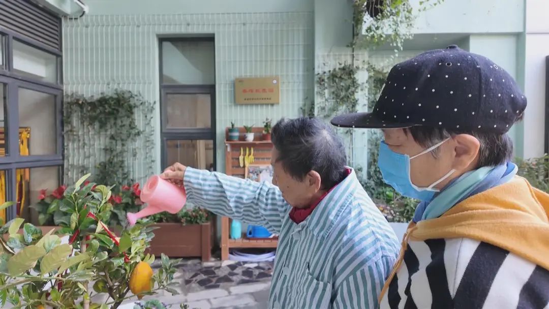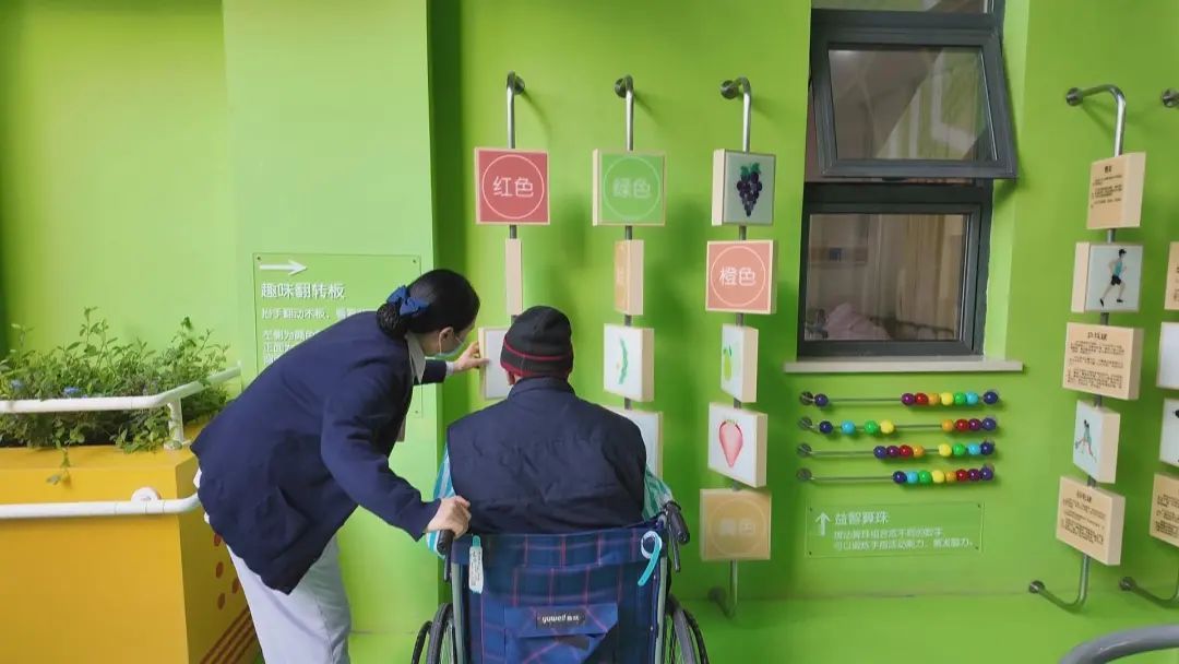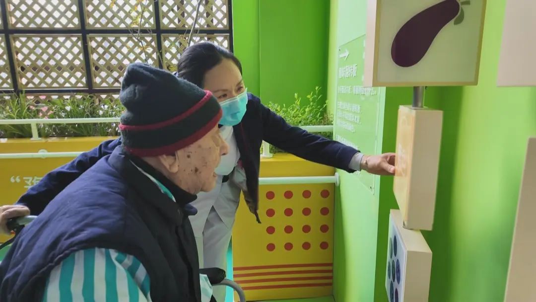 此外,利用医院的结构特点,院方还专门设置了四五个“半户外”空间,有带运动康复功能的,有可以养花护绿的,有可以欣赏“小桥流水”的,遇上太阳特别好的天气,在中午前后阳光充足的时段,护士也会带着老人来进行一些娱乐活动,晒晒太阳,让患者有愉悦的心情。