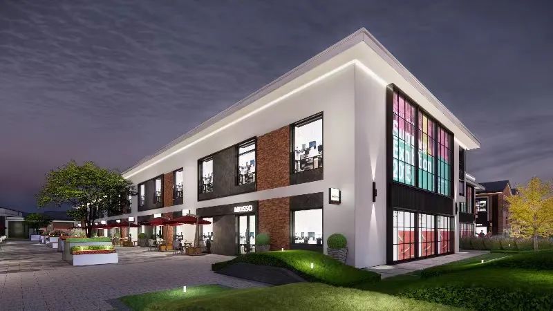 工程在保留原本楼体特征的基础上,进行了工业与时尚结合的立面改造,同时围绕周边水资源,在建筑庭院中设置商业外摆,将商业内容从室内拓展到室外,为市民提供一个休闲、娱乐的情景化院落。