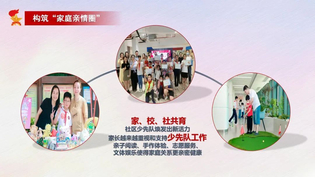 构筑“家庭亲情圈”,家、校、社共育使社区少先队焕发出新活力,更多的家长越来越重视和支持少先队工作,亲子阅读、手作体验、志愿服务、文体娱乐使得家庭关系更亲密健康。