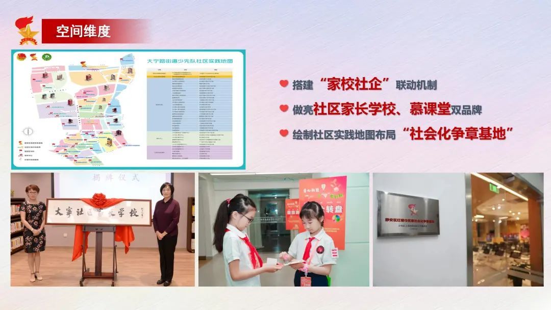 空间维度上,依托大宁优质教育资源优势,构建“家校社企”联动机制,做亮社区家长学校、慕课堂双品牌,绘制少先队社区实践地图,覆盖青年中心、新时代文明实践分中心、文体场馆、图书馆、科创实验室等校外阵地,党群服务中心挂牌成为区级“社会化争章基地”,让少先队校外实践教育的空间更广阔。