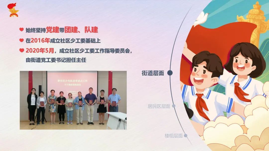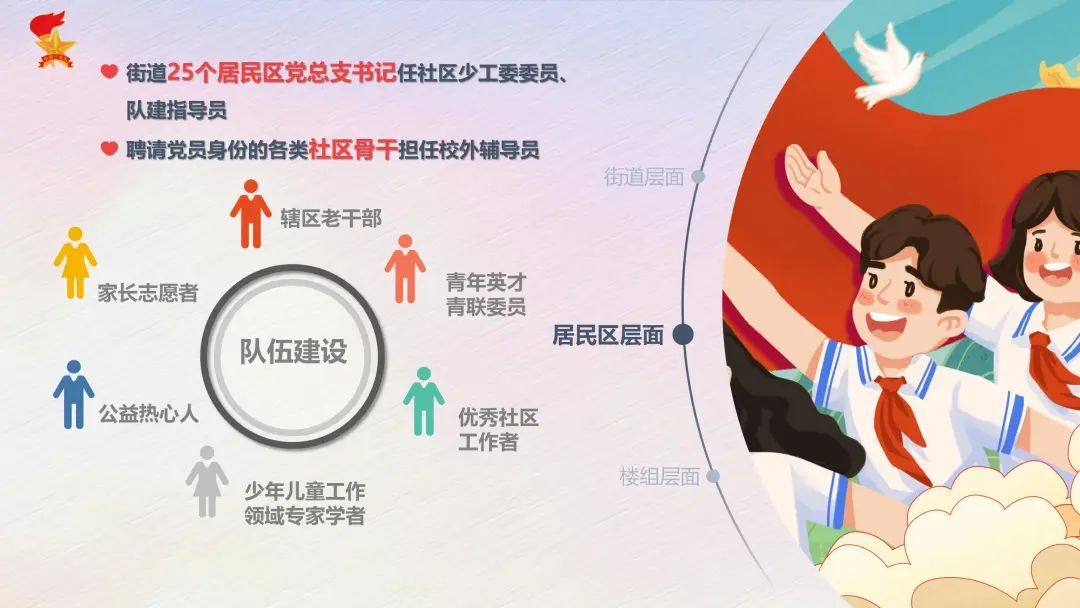 在居民区层面,辖区25个居民区党总支书记担任社区少工委委员、队建指导员,持续完善“社区大队—居民区中队—楼群混龄小队”三级网络,广泛聘请各类社区党员骨干担任校外辅导员。