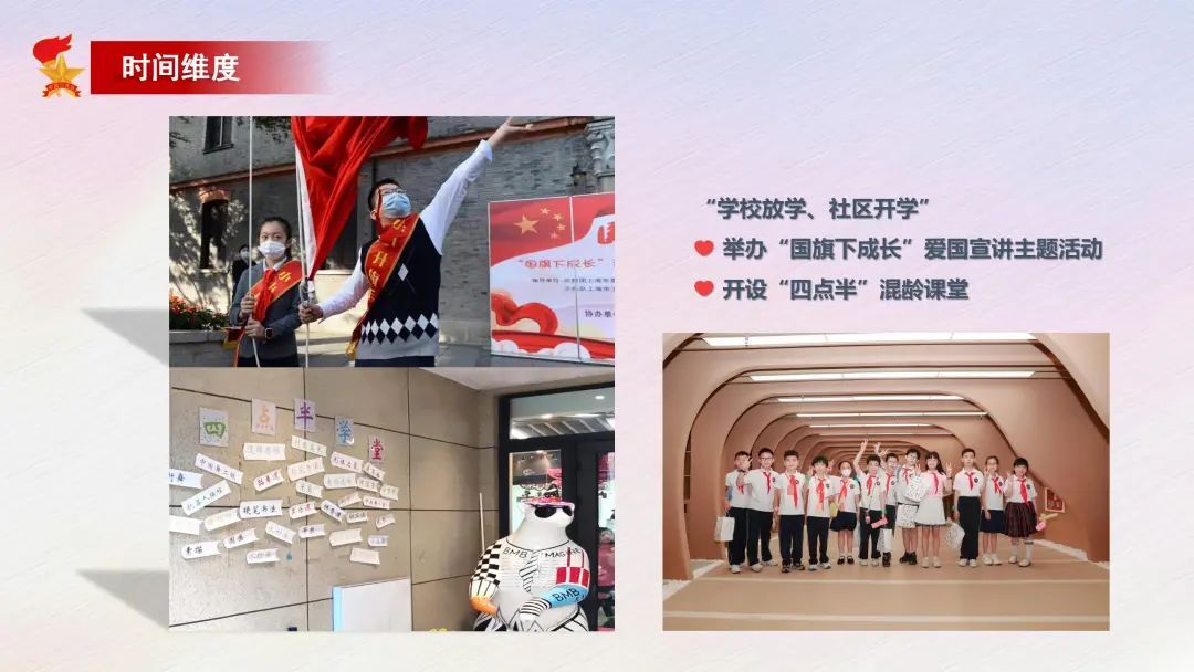 时间维度上,充分利用课后、节假日等时间,实现“学校放学、社区开学”,构建“校内+校外”评价共认、阵地共用、活动共办、队员共育机制,举办“国旗下成长”“四点半”混龄课堂等品牌活动,搭建“红领巾奖章”社区争章平台,纳入学校评价体系,让少先队校外实践教育的时间更充分。