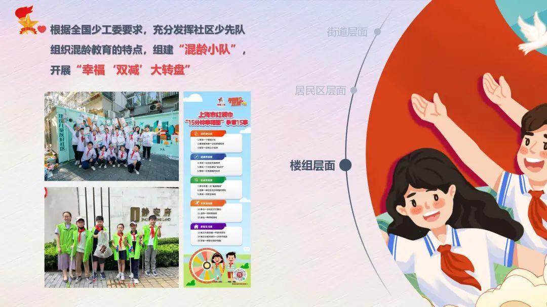 在楼组层面,充分发挥社区少先队组织混龄教育特点,组建“混龄小队”,开展“幸福‘双减’大转盘”,队员和家长分别担任“轮值队长”和“轮值辅导员”,依托“亲子阅读营”“少年军校”“爱心暑托班”激发幸福社区少先队组织内在动力。