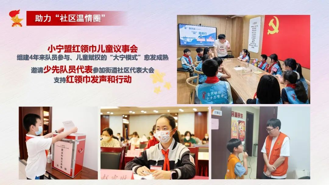 助力“社区温情圈”,组建“小宁盟红领巾儿童议事会”,每年特邀2名队员参加社区代表大会,鼓励队员贡献更多金点子,培养“人民城市人民建”的小主人翁意识。