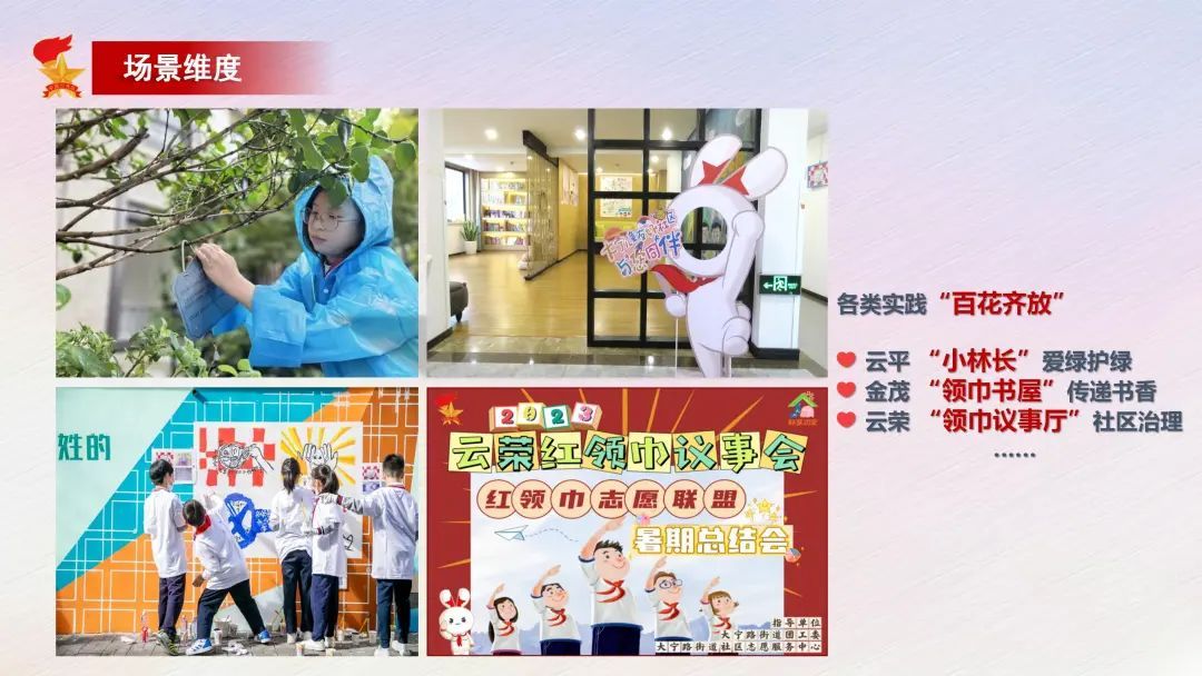 场景维度上,各居民区实现“百花齐放”,打造云平居民区“小林长”、金茂居民区“领巾书屋”、云荣居民区“领巾议事厅”等项目,让少先队校外实践教育的场景更丰富。