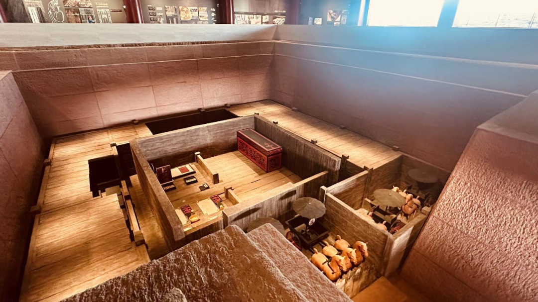 记者在现场看到,这是一座大型土圹木椁墓,椁室由内藏椁、回廊形外藏椁、过道和甬道等构成,居室化风格明显。墓室深约8米,南北向长约16米,东西向宽约17米,一条长长的墓道斜向从南边连入墓室。为了保护遗址本体,游客将从墓室上方另外建好的通道进入主墓,在观景台上俯瞰整个墓室的布局。