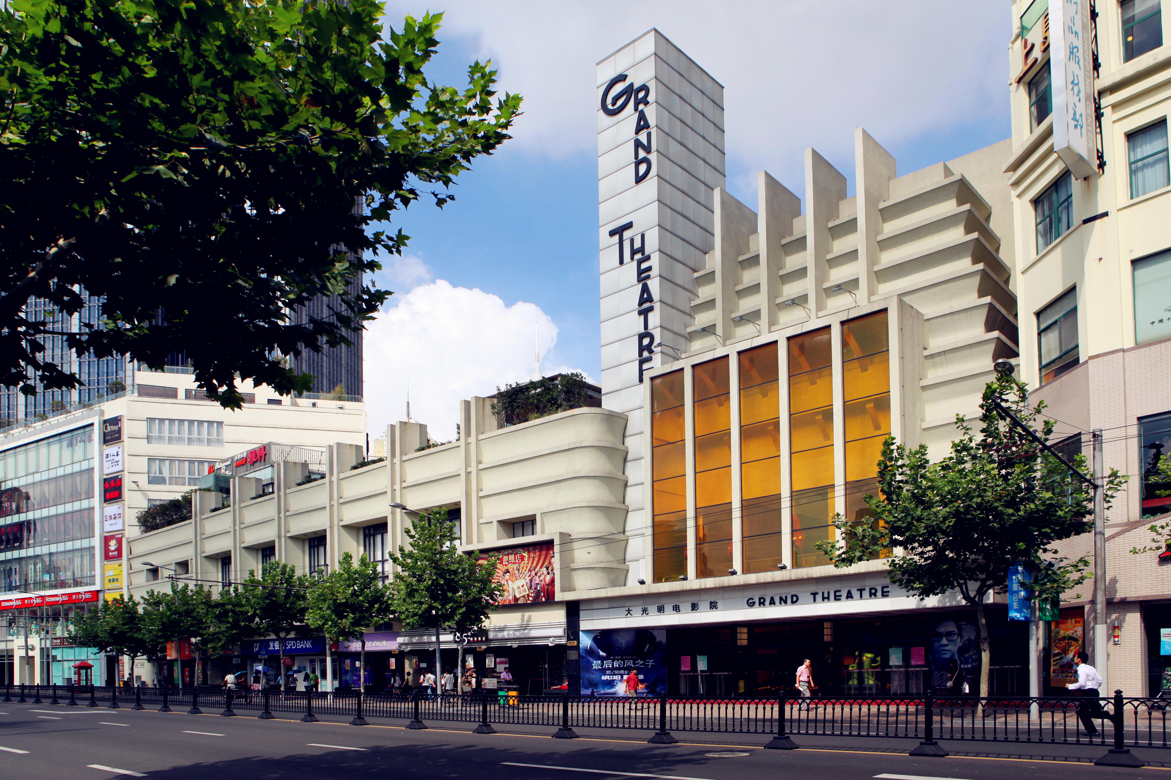 始建于1928年的大光明电影院,由梅兰芳亲自揭幕,拉开了这座特级影院的辉煌历史。1933年,邬达克设计重建。大门上方的玻璃灯塔,夜晚灯火通明,曾经是周围一大片空地上的独特标志。数公里外都可望见的它既是一个巨大的灯柱,又仿佛远洋轮上晶莹剔透的大烟囱。而正门上方近百平米的玻璃幕墙,每逢有重要影片首映或影展开幕时就会挂上巨幅海报,宣传效果独此一家。