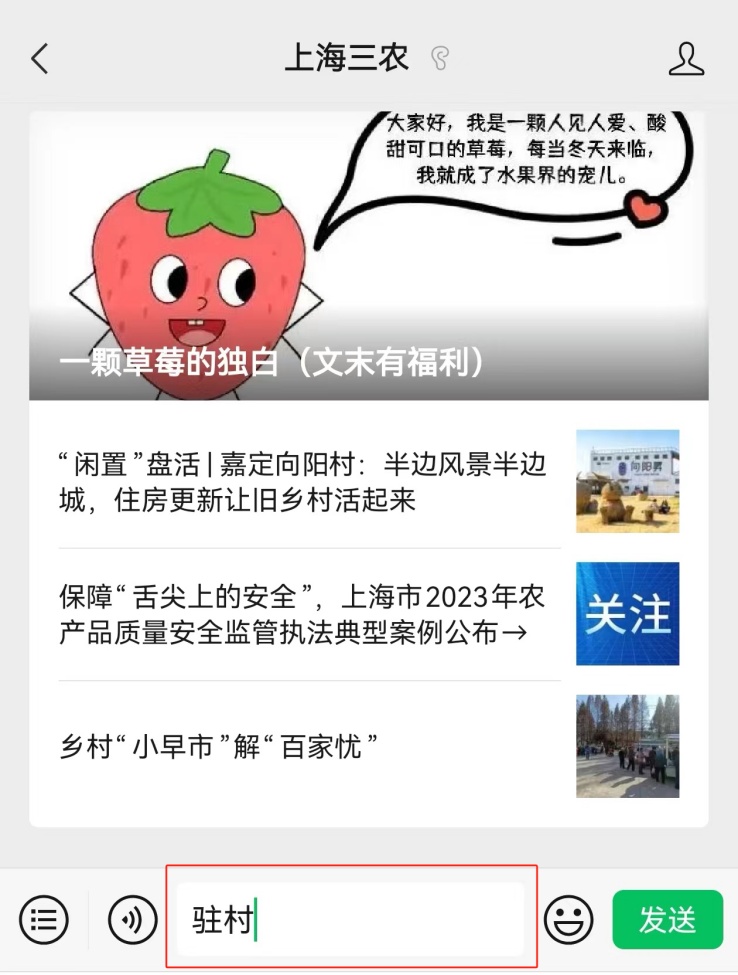 第一步:关注“上海三农”微信号,在微信后台对话框回复“驻村”参与投票。