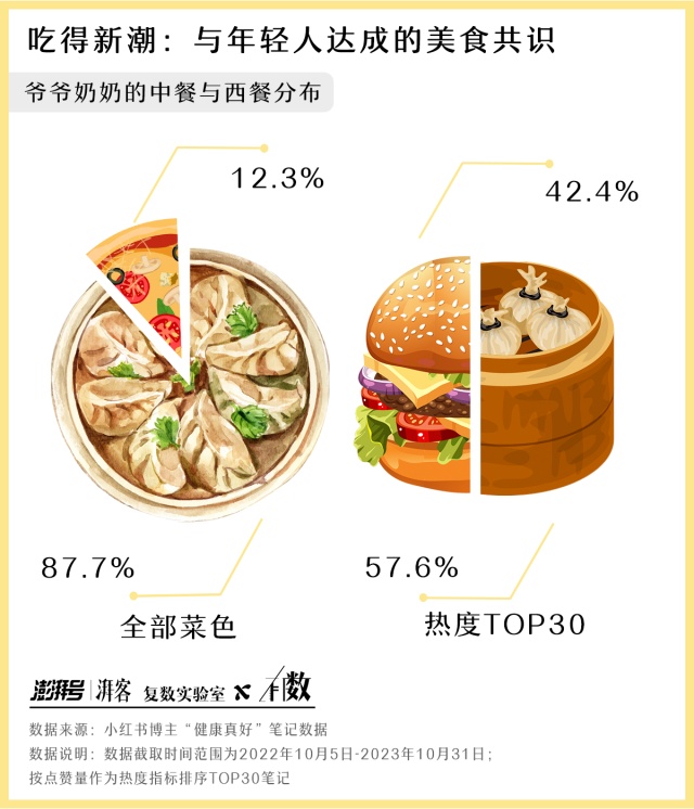 显然,年轻人们也爱看爷爷奶奶吃西餐。虽然爷爷奶奶晒出的全部用餐中,西餐只占 12.3%,但在热度最高的 30 条笔记里,占比接近半数,达到 42.4%。