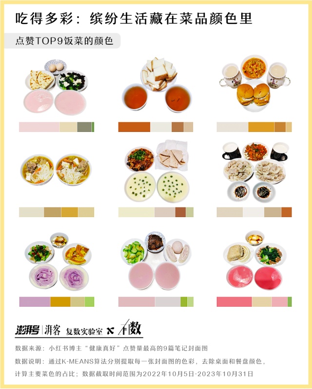 我们将点赞数最多的 9 条食物笔记的颜色提取出来,从汉堡的温暖明黄到红菜头糊糊的淡淡粉色,食物颜色缤纷多彩、相互映衬,哪怕隔着屏幕,也让人感到食欲被牵动,心情被治愈。