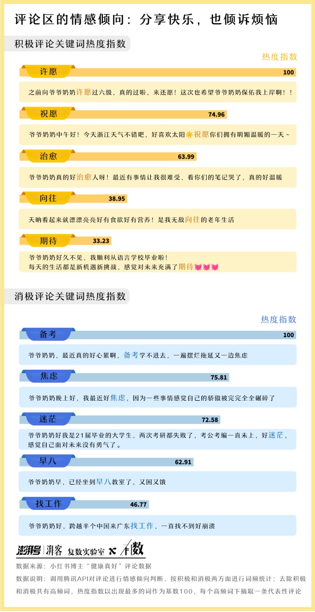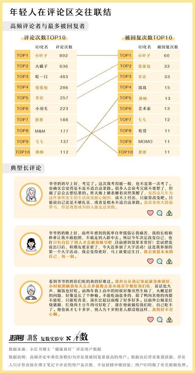 他们的规律饮食也慢慢成为了年轻人们定时定点的陪伴。“有时候爷爷奶奶晚了几分钟发笔记,就会好奇他们为什么还没有发布,感觉心头空落落的,感觉今天好像少了一个可以去问候、去诉说的人”,忠实粉丝“小谢”如此说道。