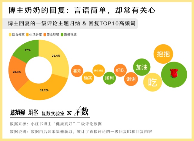 对于称赞美食、传达祝愿的评论,爷爷奶奶常常以点赞传递感恩,而当评论内容是关于年轻人自己的生活和饮食分享时,爷爷奶奶则会通过简单朴实的回复给予反馈,“”和“抱抱”是出现次数最多的高频词。