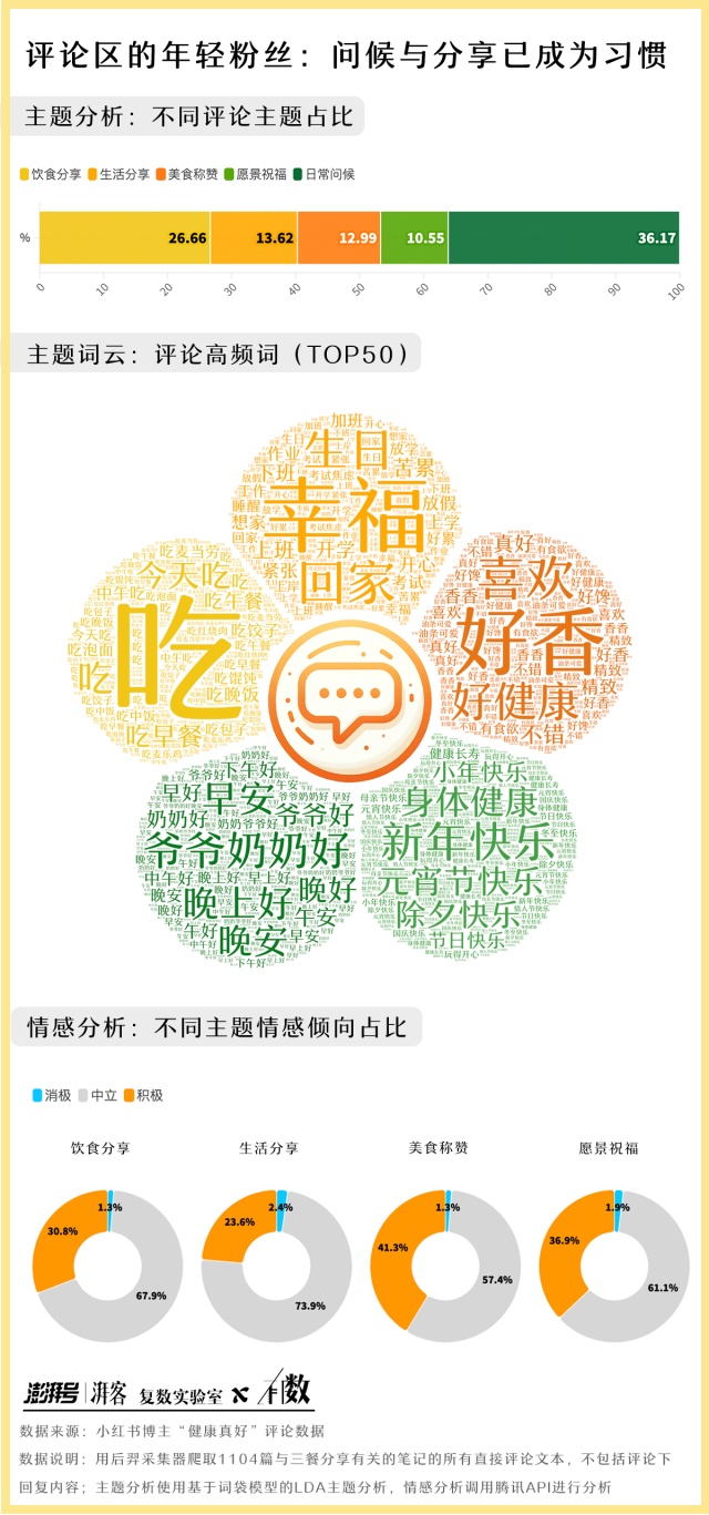“饮食分享”、“生活分享”、“美食称赞”、“愿景祝福”这四类评论主题里,个人生活有关的评论中藏有更大比例的消极情感。相比许愿上岸、打卡上学等,在陌生人的笔记下讲出自己的苦恼,必然更难敞开心扉。