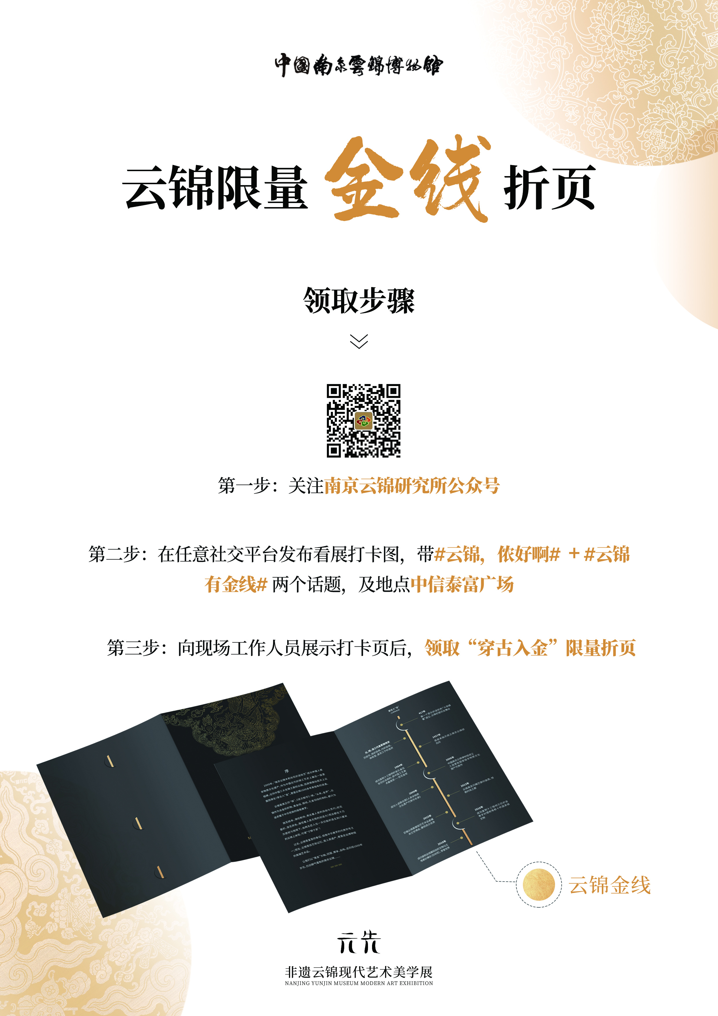 是不是很想要收藏一根云锦金线?那就赶紧来正在中信泰富广场三楼举行的“元先”非遗云锦现代艺术美学展,加入云锦“穿古入金“限量折页领取活动。