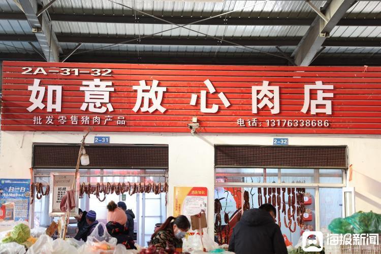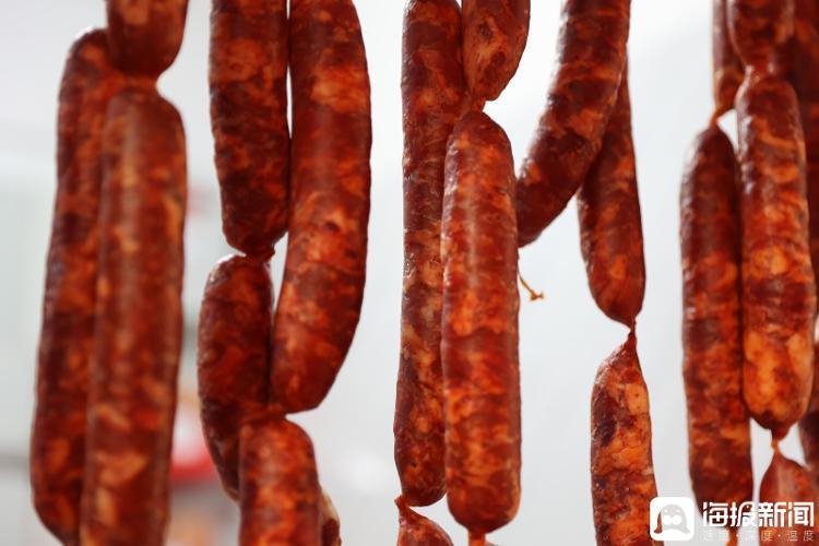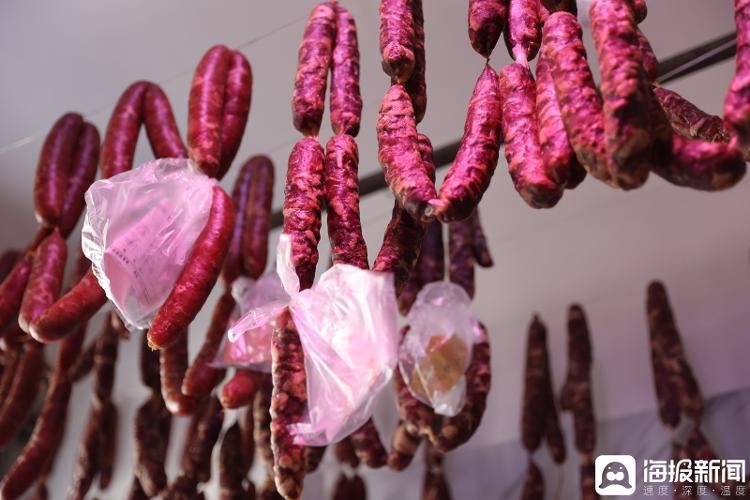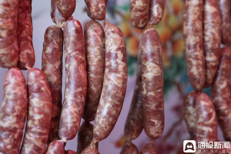 记者走进市场入口处的一家如意放心肉店,只见一串串红白相间的香肠悬挂在晾晒绳上,一股浓浓的肉香味儿扑鼻而来。