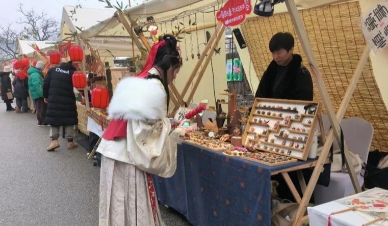 集市现场,胶东花饽饽、锡镶、刻瓷、玻璃画、剪纸等多家非遗展位纷纷亮相,让市民和游客们近距离了解非遗,体验非遗魅力,感受元旦浓浓的民俗。20多个古韵十足的国风集市摊位带领市民及游客穿越时空,梦回千年。