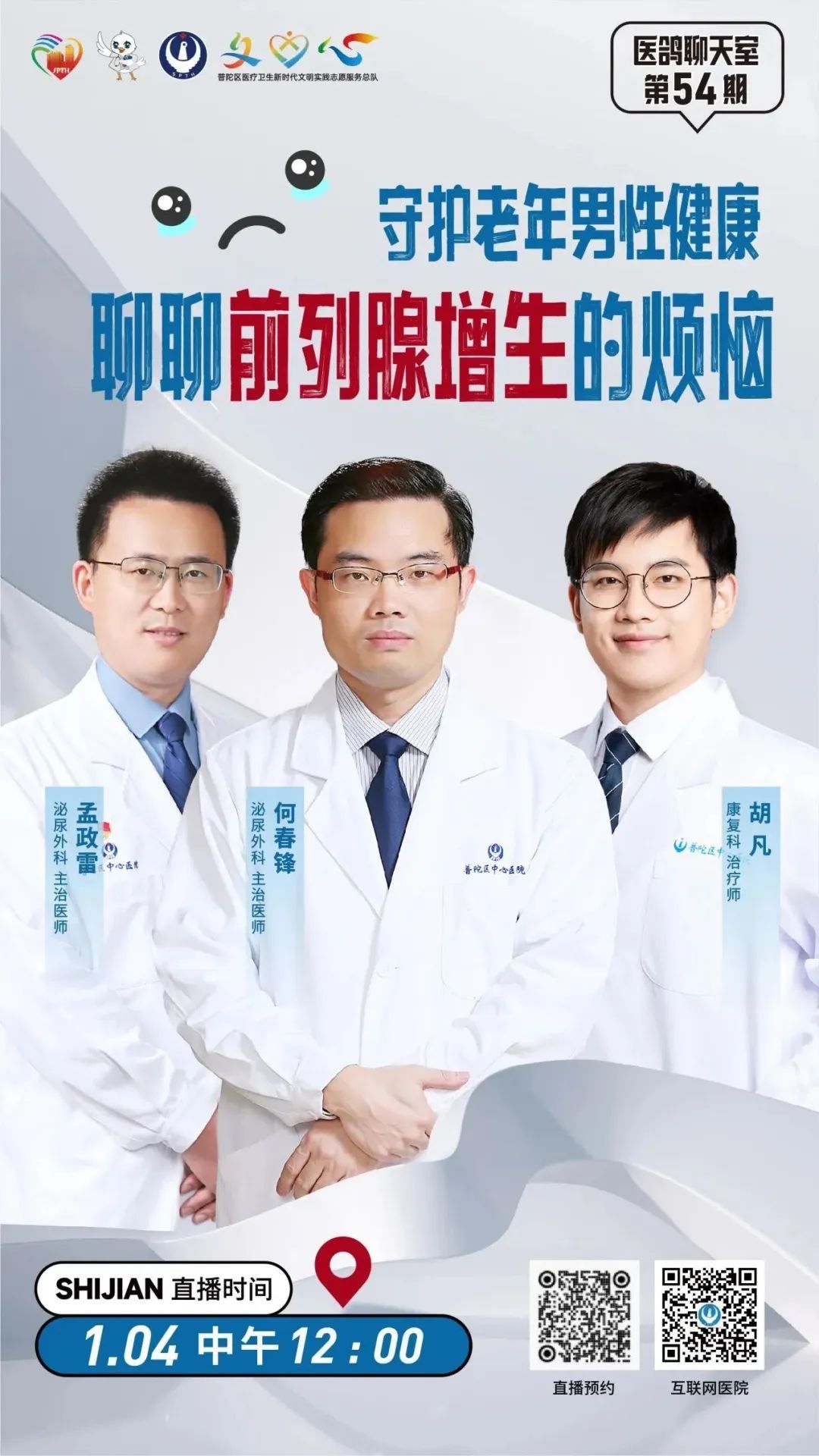 1月4日(周四)12:00,普陀区中心医院5G健康直播间将以《守护老年男性健康,聊聊前列腺增生的烦恼》为主题,由泌尿外科主治医师何春锋,主治医师孟政雷,康复科治疗师胡凡一起搭档,带你了解老年男性的前列腺“烦恼”。观众朋友们,让我们不见不散~