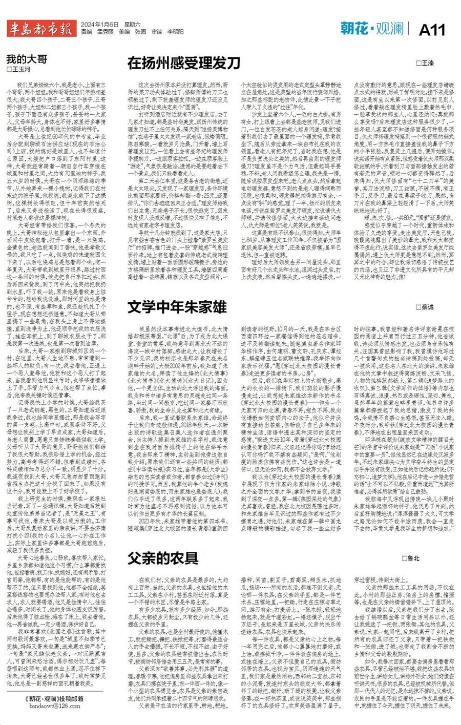我上研究生的时候,兼职在一家报社当记者,写了一些通讯稿,大哥知道后就到处宣传他弟弟当记者了,是“无冕之王”,有事可找他,看来大哥是以我为傲的。工作后,大哥反复给家里的亲戚讲,不要去济南打扰小四(我的小名),让他一心扑在工作上。实际上家里许多事都是大哥跑前跑后,减轻了我很多负担。