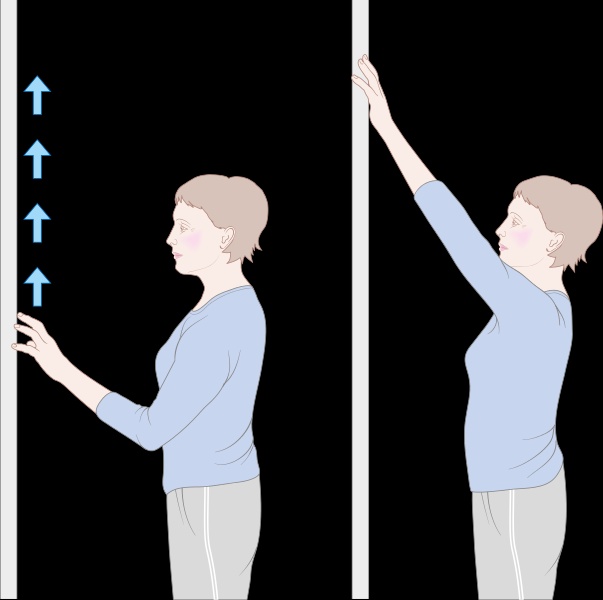 体操练习:双手握住体操棒,在体前,手臂伸直,然后反复用力向上举,尽量向头后部延伸;在体后,双手握棒,用力向上举。手指爬墙练习:侧面或前面站立,抬起患侧的前臂,以食指和中指贴墙,然后沿墙向上慢慢做爬墙式运动,到达所能承受的最高点后,稍停顿或下压。患侧手臂上举,反复摸后脑勺:病侧手于体后,上抬摸背部。如果患侧手臂活动不便,可用健侧手帮助患侧手上抬。